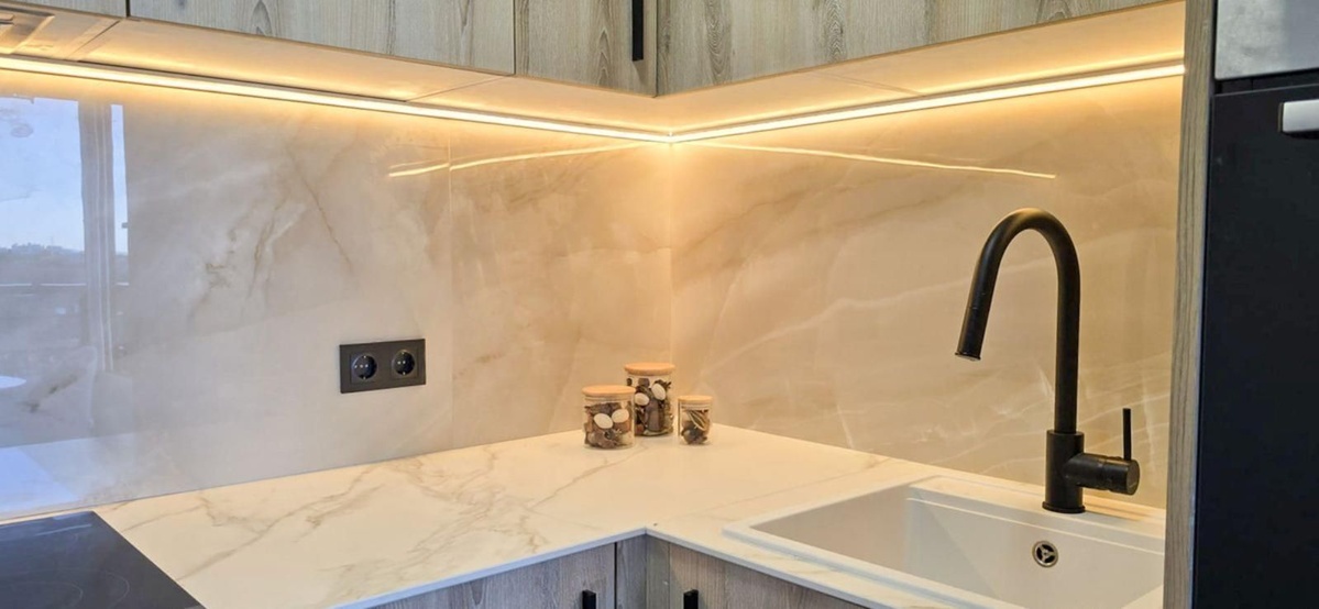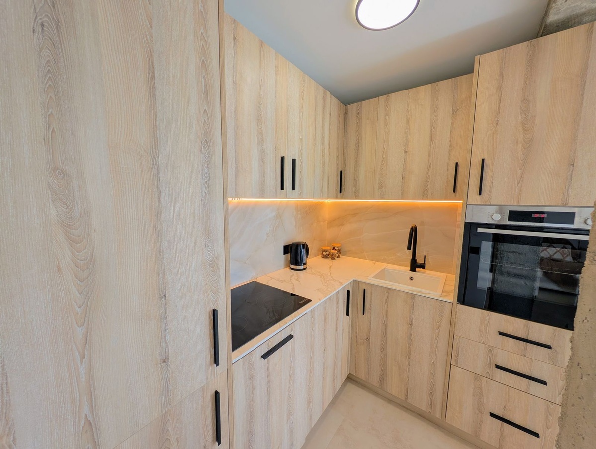 Det fuldt udstyrede køkken har LED-belysning og førsteklasses tyskproducerede Bosch-apparater, herunder opvaskemaskine og vaskemaskine, som alle er udvalgt efter ydeevne og pålidelighed.