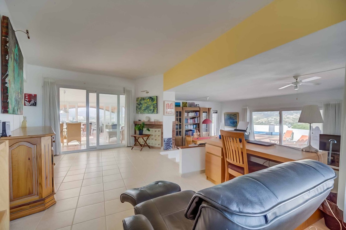Inside, the house impresses with its large living room with a small level difference, combining a cozy reading area with desk, a seating area with fireplace, dining area, and separate kitchen, all flooded with natural light thanks to its large windows.