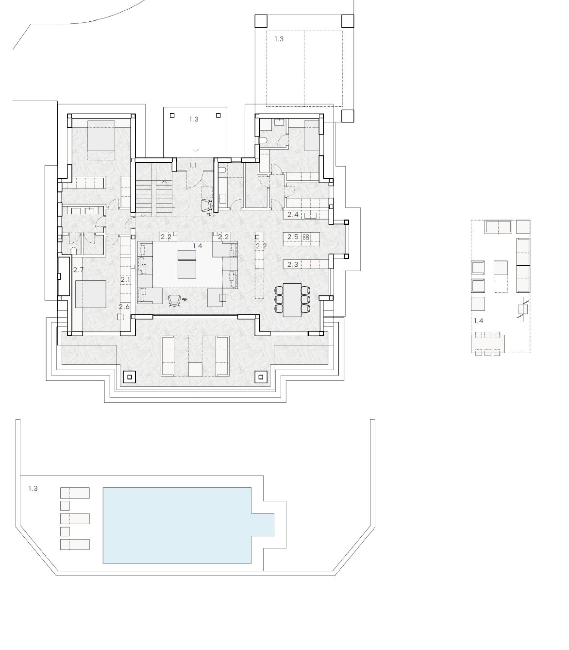 The villa includes a complete renovation and interior design project by the renowned Fran Silvestre Arquitectos. The new layout features a fully renovated kitchen seamlessly integrated with an open-plan dining area overlooking the pool. The living room suite boasts breathtaking panoramic views of the lush garden and surrounding oak forest.