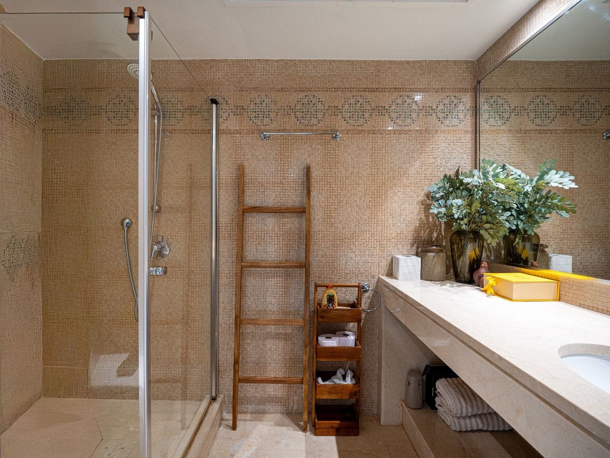 The layout is designed for comfort, with a spacious open-plan living and dining area that opens to a covered terrace for dining and lounging. The kitchen is modern and practical, with a separate utility room. Both bedrooms are generous in size, with fitted wardrobes, private terraces, and countryside views that create a sense of retreat.