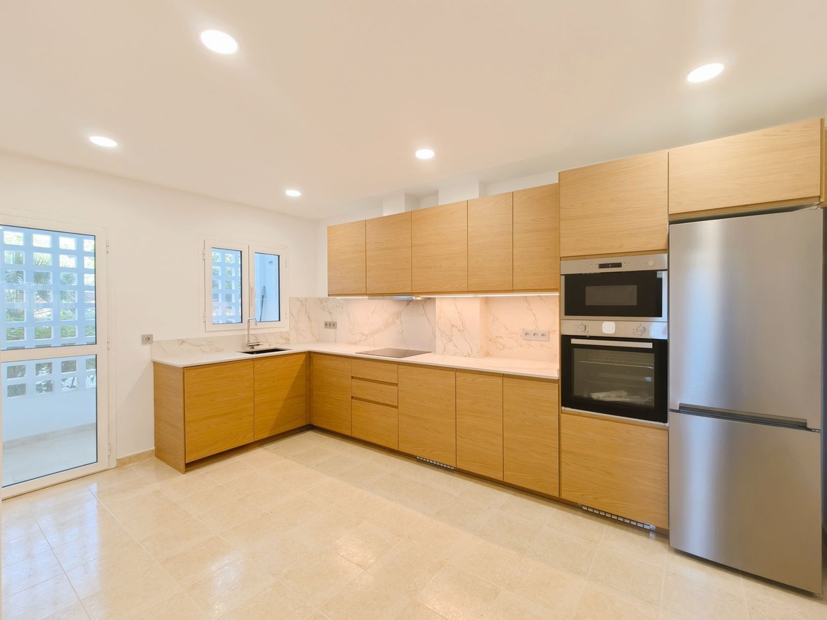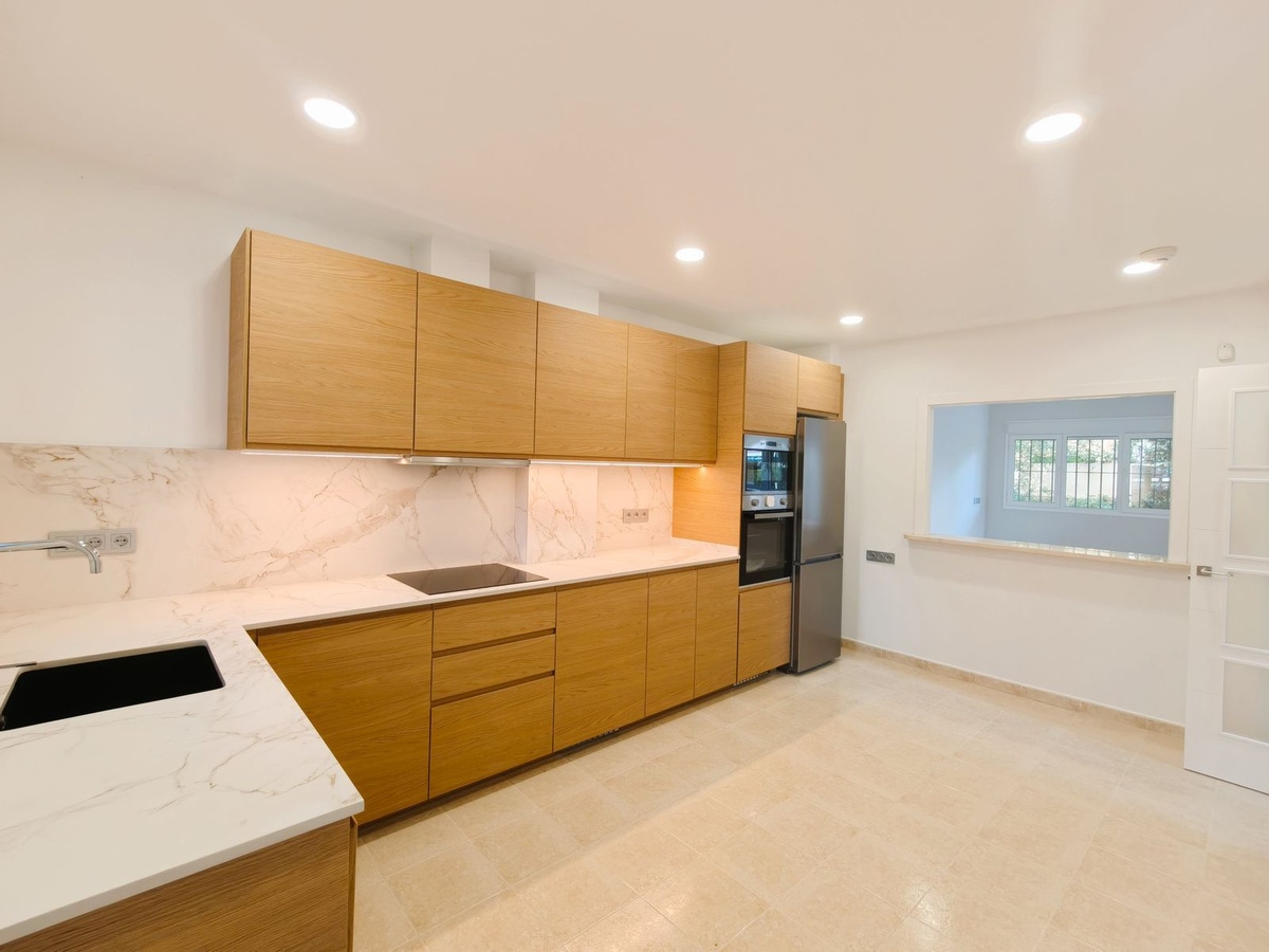 The property features a bright and spacious living room with a cozy fireplace and a dining area, seamlessly connected to the large, newly renovated and fully equipped kitchen through a wide opening that enhances the sense of space and light. From the living room, you step directly out to a private garden.