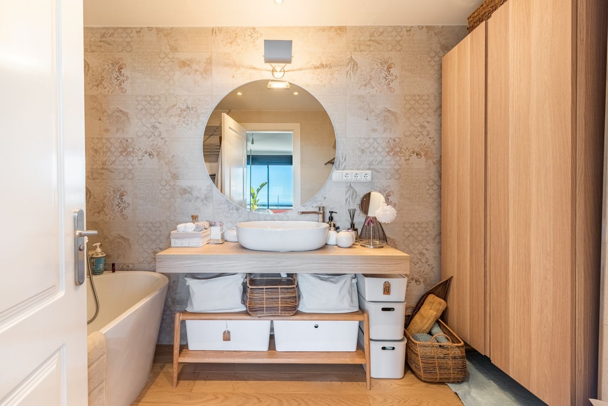 The bedroom area that contains the master bedroom and a second bedroom also has amazing sea views from both bedrooms with direct access to the terrace. One bedroom is “en-suit” with a bathroom with both a bathtub and a shower. The second bathroom in the hallway is having a shower.