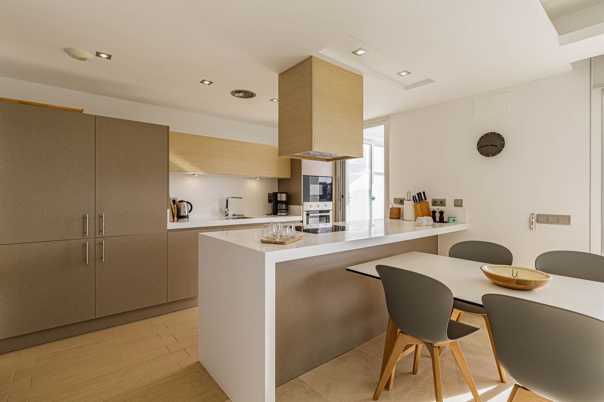 Den lyse stue og spisestue i åbent plan flyder problemfrit ud på den rummelige terrasse og skaber et enestående indendørs-udendørs opholdsrum, der er ideelt til at nyde middelhavsklimaet året rundt. Gulv-til-loft glasdøre maksimerer naturligt lys og indrammer smukt udsigten over de anlagte haver, fælles pools og bølgende fairways. Det fuldt udstyrede moderne køkken er udstyret med kvalitetsapparater og rigelig opbevaring, suppleret med et separat bryggers for ekstra funktionalitet.