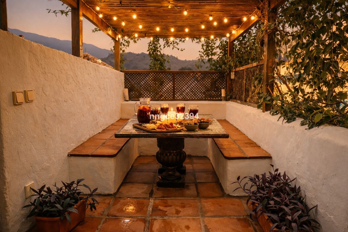 Boligen er fordelt over flere niveauer og udfolder sig med en naturlig flow og en behagelig følelse af privatliv. De primære opholdsrum er kendetegnet ved traditionelle terrakottagulve, klassiske proportioner og en varm, indbydende atmosfære, der afspejler sjælen i et autentisk andalusisk hjem. En vinbeklædt terrasse danner en intim ramme for udendørs middage og afslappede aftener, mens tagterrassen (solarium) byder på åbne udsigter over landsbyen og bjergene — ideel til solnedgangsdrinks eller rolige morgener.