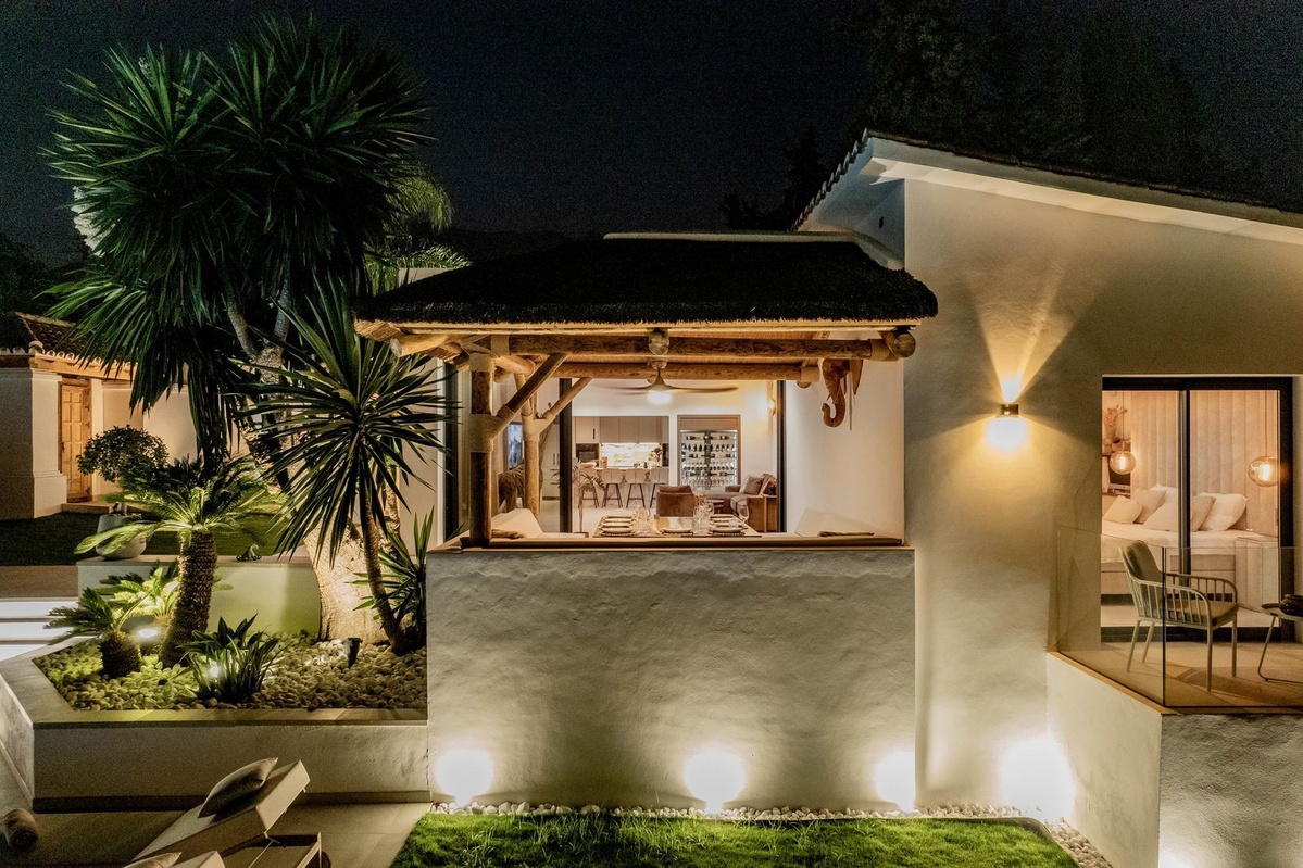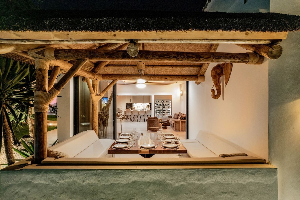 Descending to the pool and garden level, you'll discover three additional ensuite bedrooms, each with fitted wardrobes and their own terraces, ensuring every guest enjoys their own slice of paradise. Exterior areas abound with spacious open areas and terraces, including a wooden pergola covering a dining area for twelve, ideal for alfresco dining under the stars.