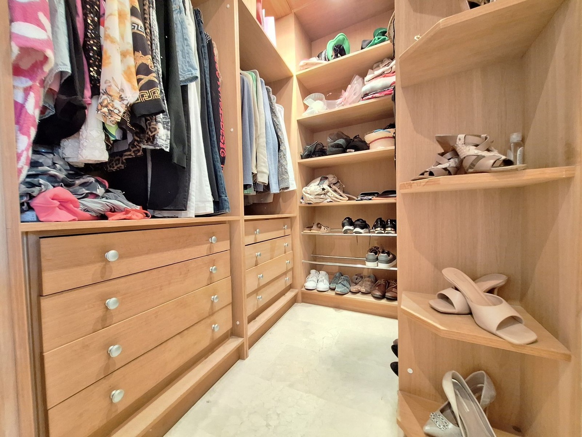 Further along the corridor, you enter a bright, closed hallway area that leads to the bedroom accommodation. The master suite is spacious and welcoming, offering extensive storage, a walk-in dressing area and an en-suite bathroom with bathtub. The master bedroom opens directly onto the terrace and enjoys breathtaking panoramic views of the mountains, sea and golf.