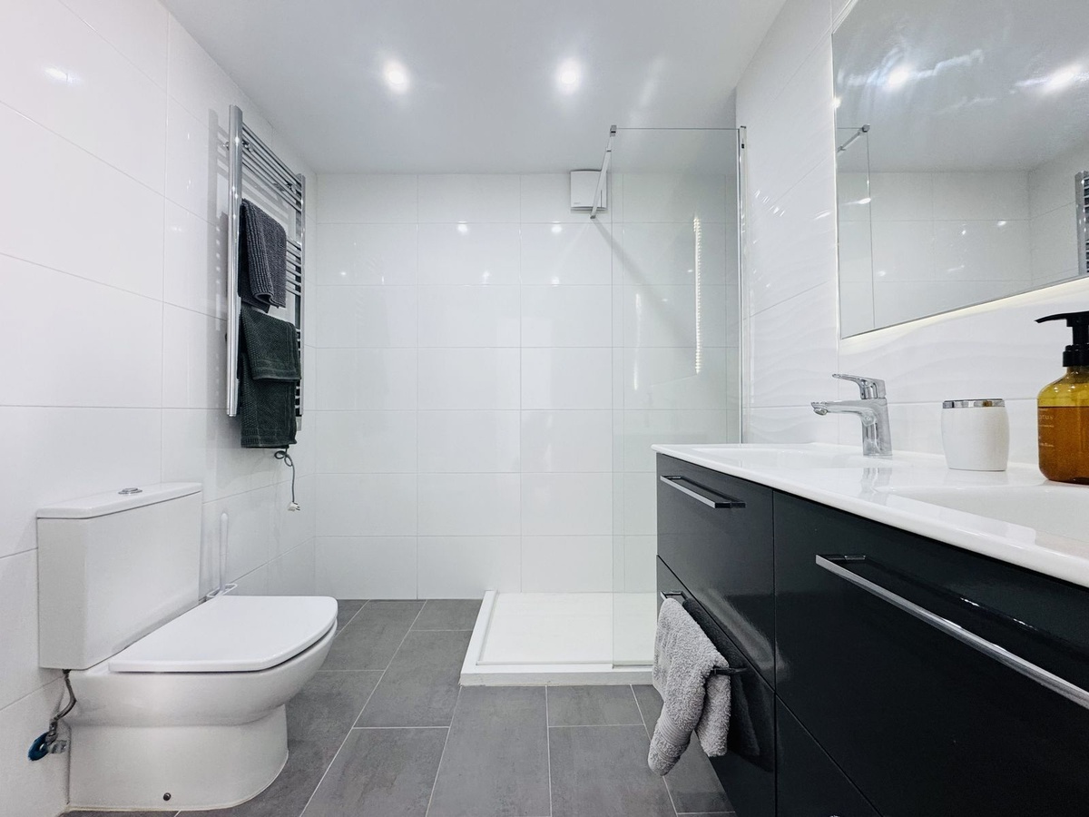The property offers two generous double bedrooms, including a master bedroom with fitted wardrobes and breathtaking sea and marina views. There is individual air conditioning in every room of the apartment, ensuring all year-round comfort. A large contemporary bathroom features a walk-in shower.