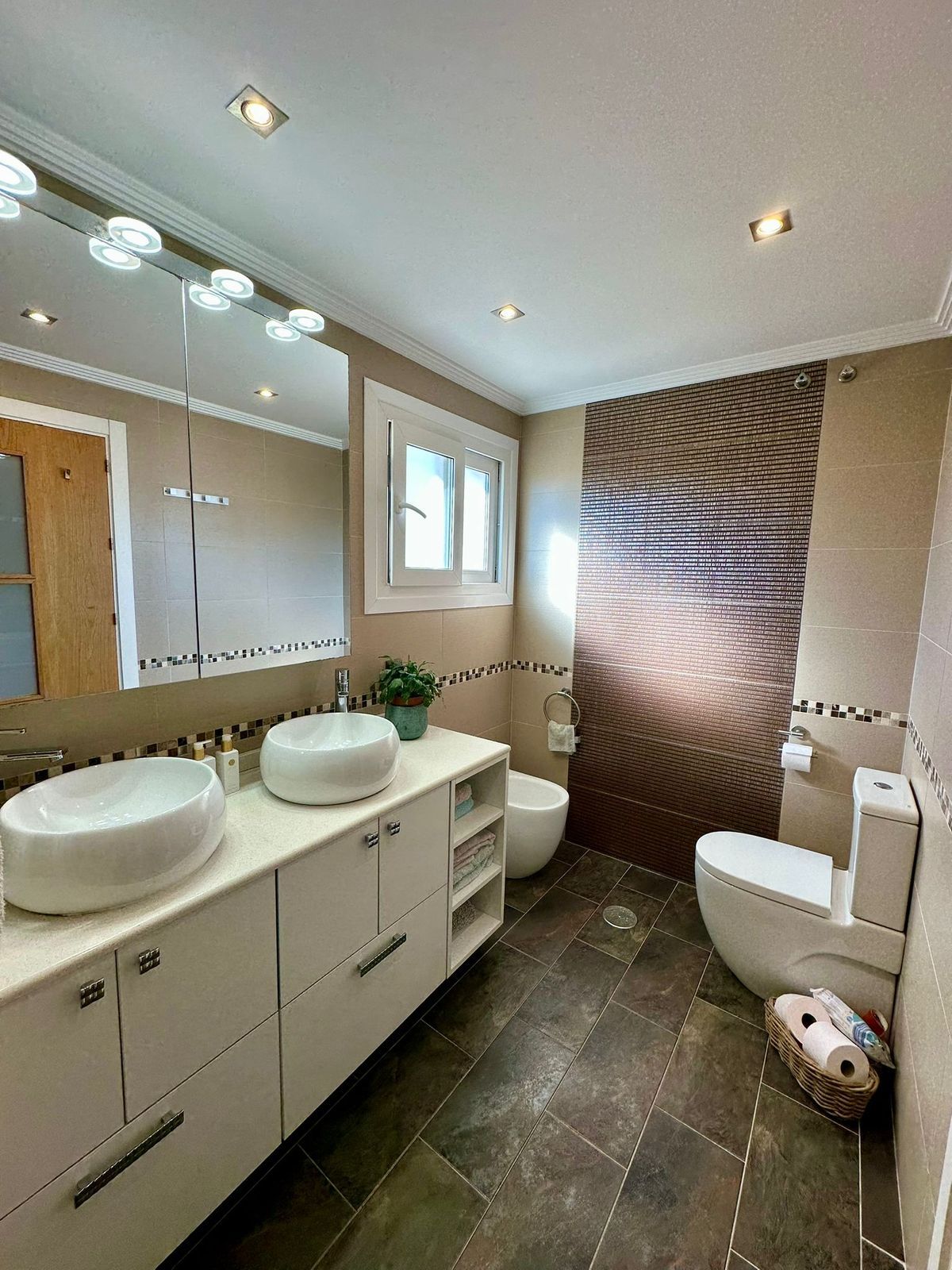 This level also includes a guest toilet, laundry room and a generous bedroom with en-suite bathroom. The upper floor offers three additional bedrooms and two bathrooms, highlighted by the impressive master suite, which features an en-suite bathroom and a large private terrace with spectacular panoramic sea views. The property is fully equipped with central heating and centralized air conditioning, electric shutters for enhanced comfort and security, and newly installed solar panels.