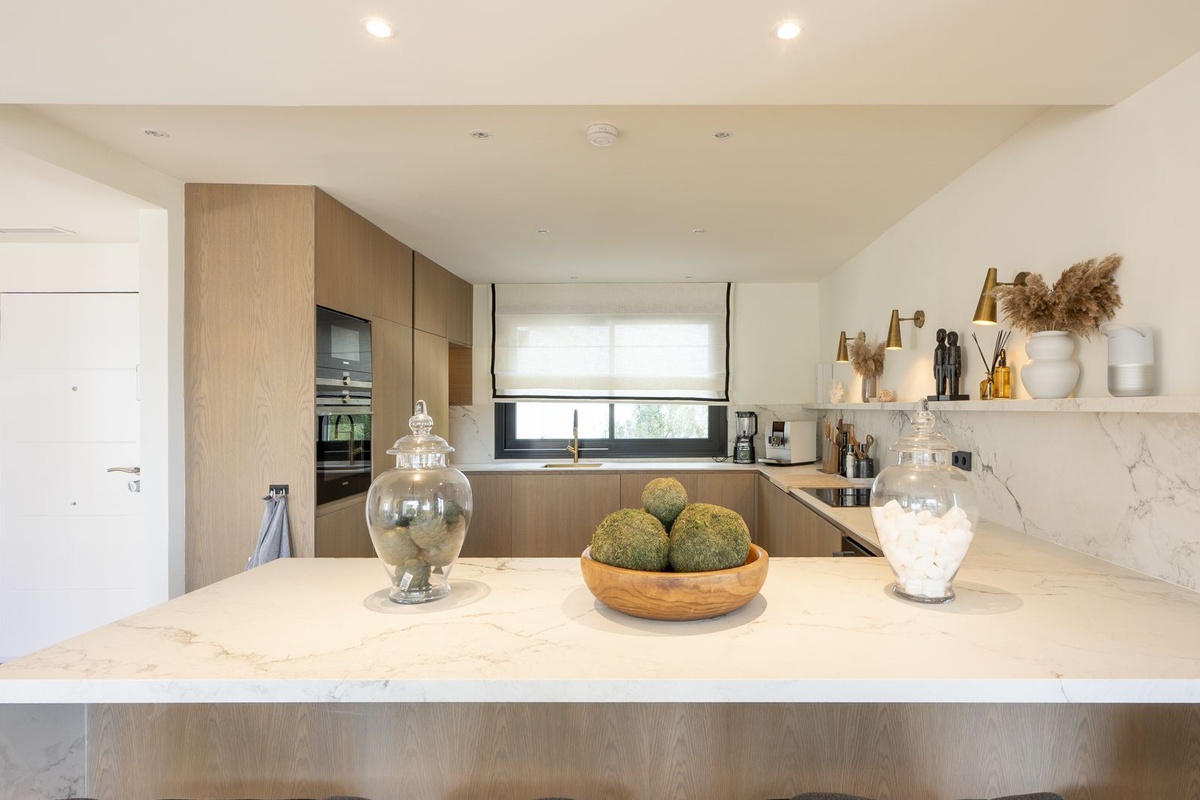 Det indre af penthouset er blevet omhyggeligt redesignet for at skabe et lyst og flydende boligmiljø, der passer perfekt til moderne middelhavslivsstil. Boligen byder dig velkommen med et elegant åbent opholds- og spiseområde, sømløst forbundet med et moderne køkken, der udgør hjertet af ejendommen.