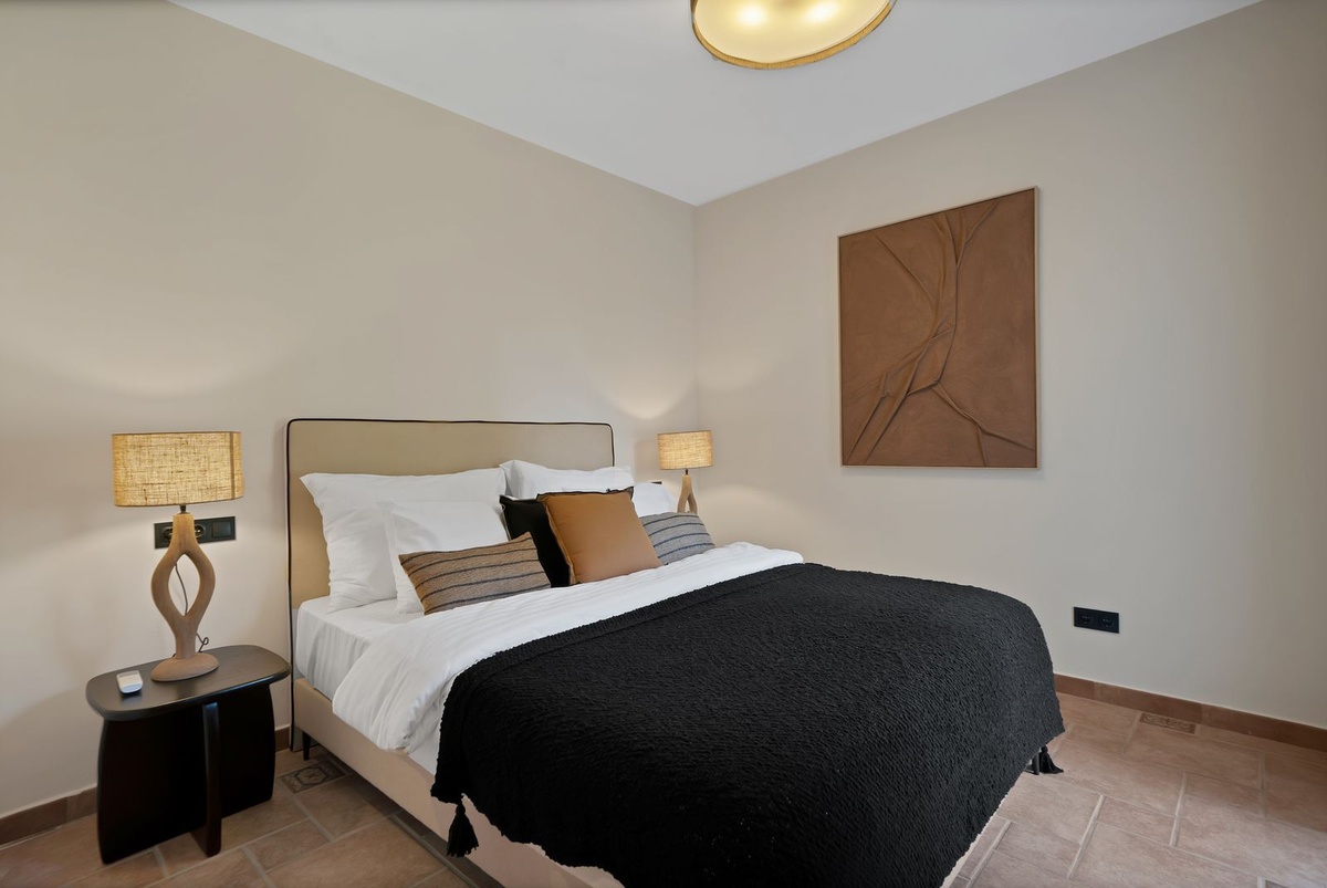 På denne etage ligger også to yderligere soveværelser, begge med direkte adgang til haven, samt et fælles badeværelse. En perfekt planløsning for gæster eller familiemedlemmer, som værdsætter privatliv og direkte adgang til udendørsarealerne.