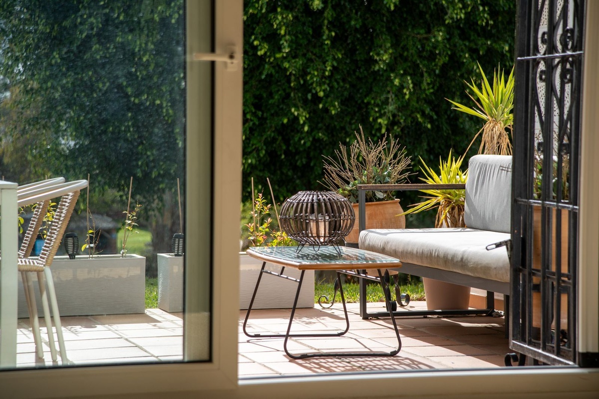The south-facing orientation ensures abundant natural light throughout the day in both the living room and main bedroom, while offering open views over lush green areas with no buildings in front, guaranteeing privacy and an uninterrupted sense of space. Outdoor living is a key highlight, with two private balconies and a generous terrace, ideal for entertaining, dining al fresco, or simply enjoying the Mediterranean climate.