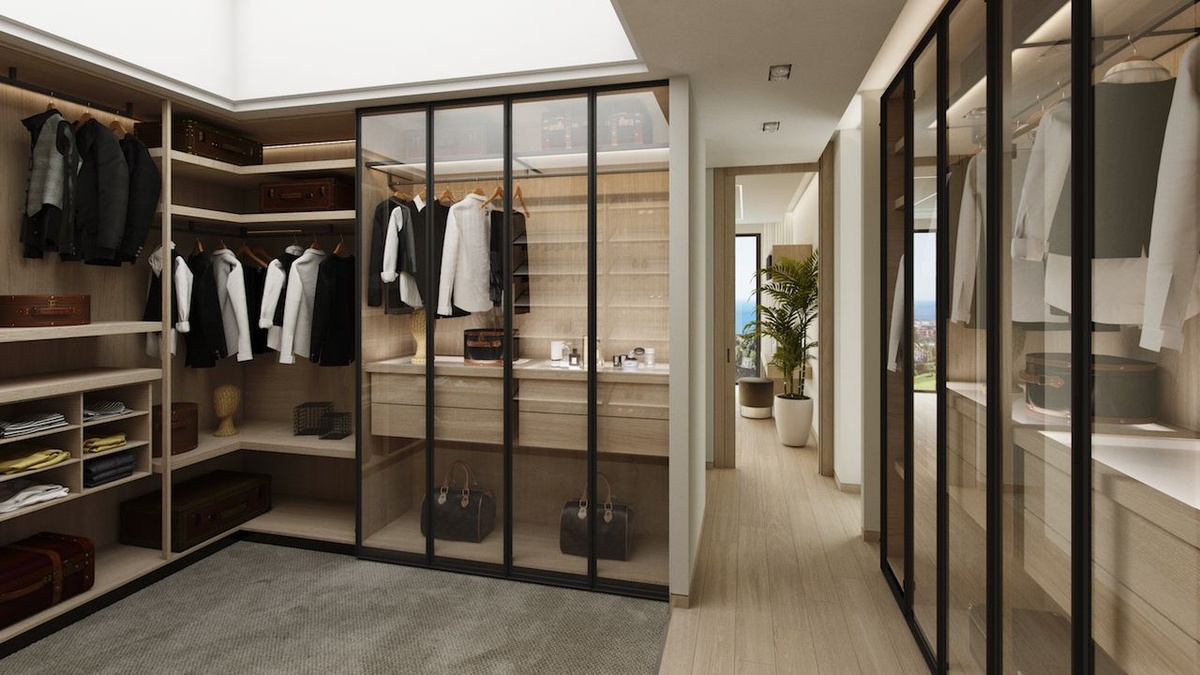 The master bedroom includes a large dressing room with fitted wardrobes, private terrace with solarium and chill-out area.