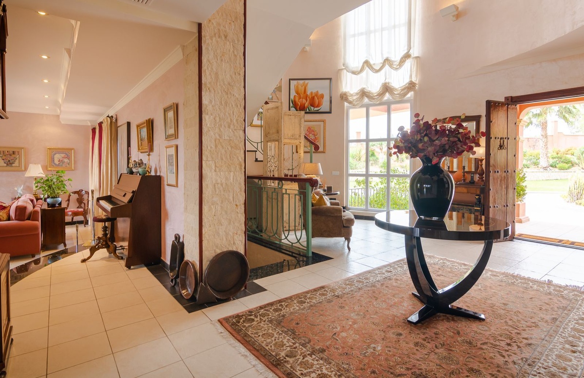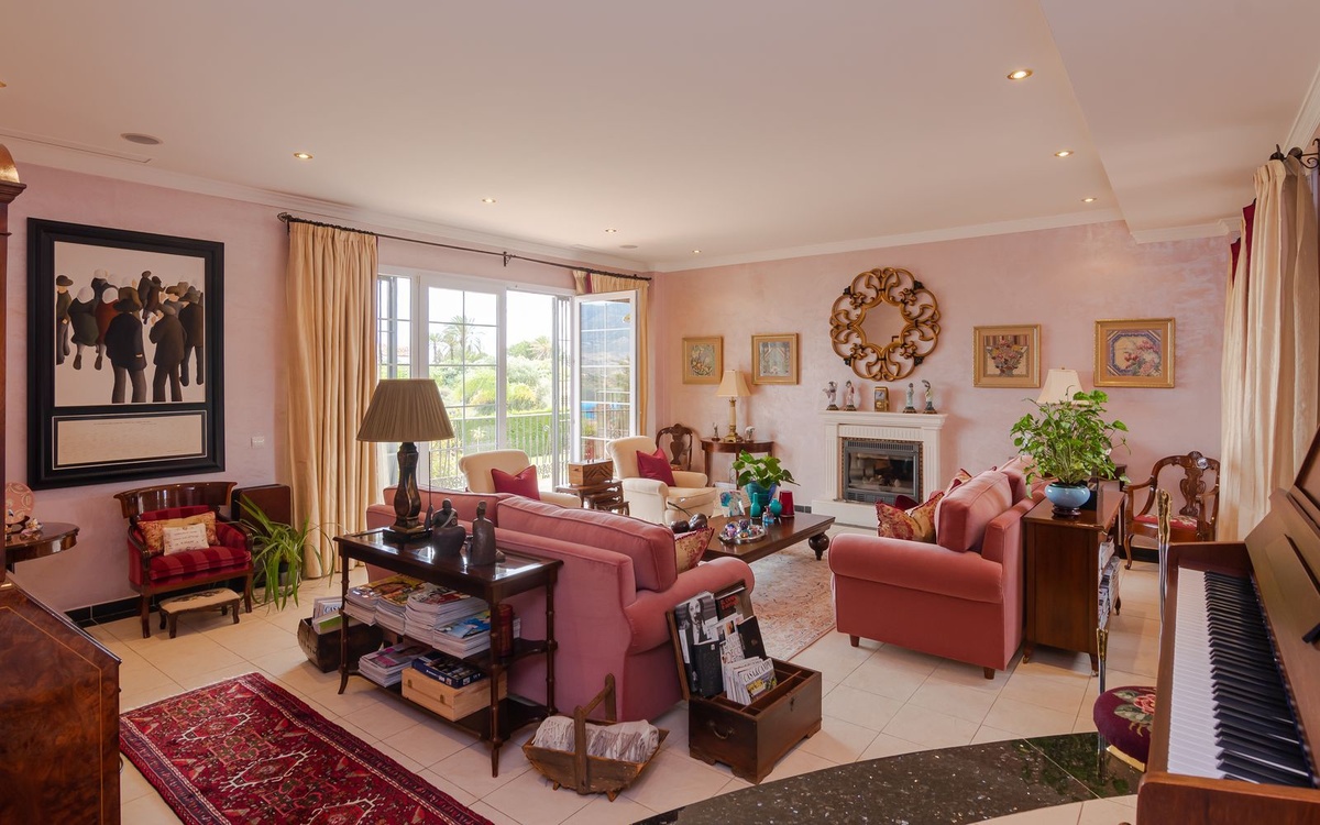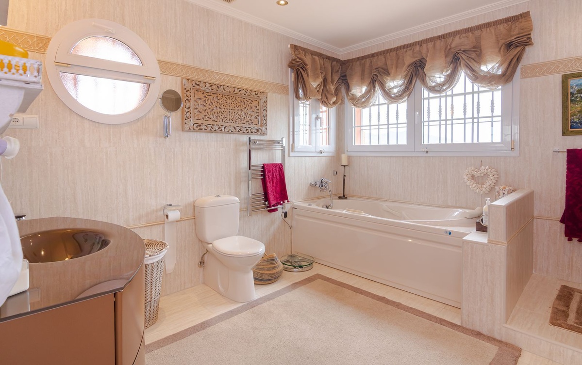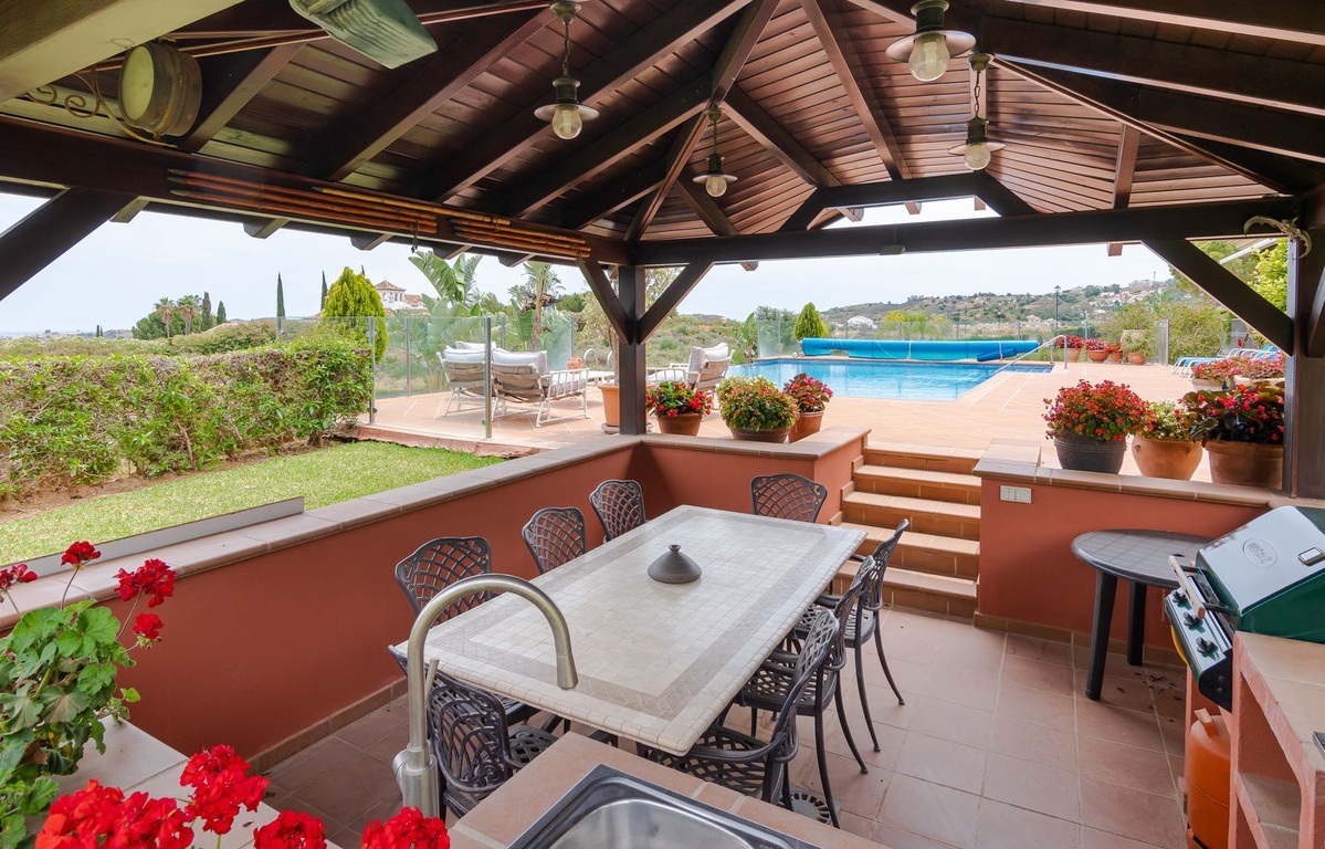 Andalusian style, immaculate property in great condition. 5 bedrooms, 4 bathrooms, 1 toilet, sauna, private infinity pool overlooking the sea. Very quiet and very private area to enjoy the tranquility and atmosphere of the area. The property consists of 623 m2 built on a 10,000m2 plot. 360º view of golf, mountains, sea and more.
