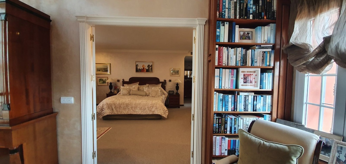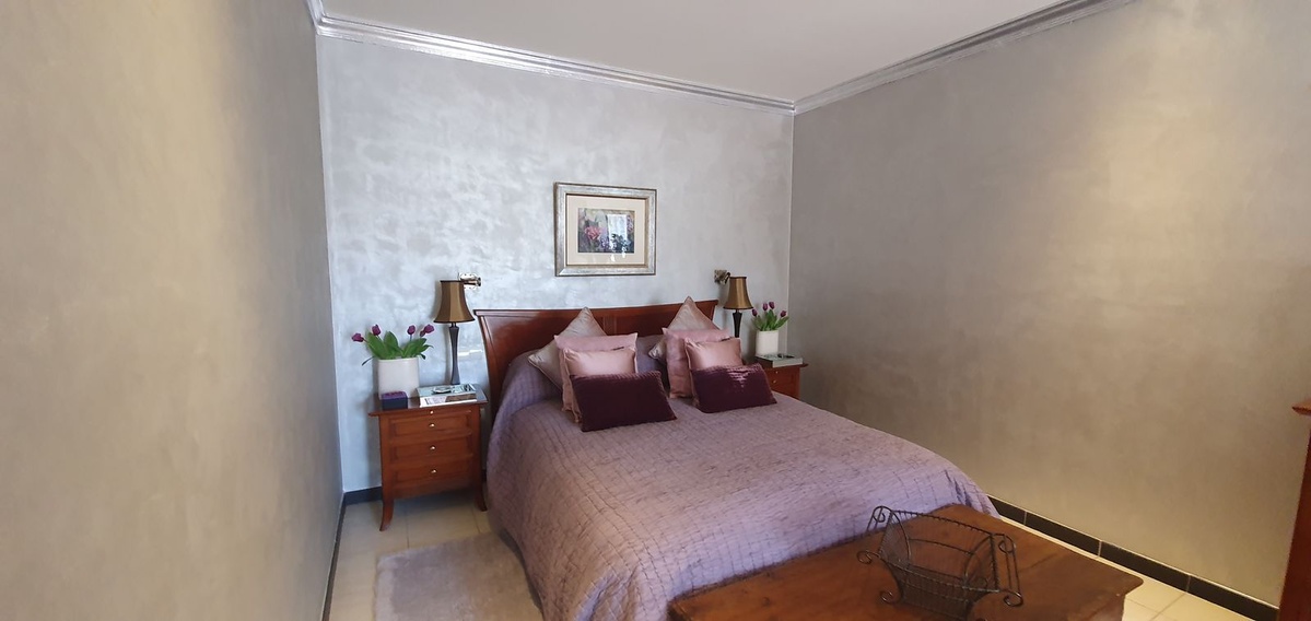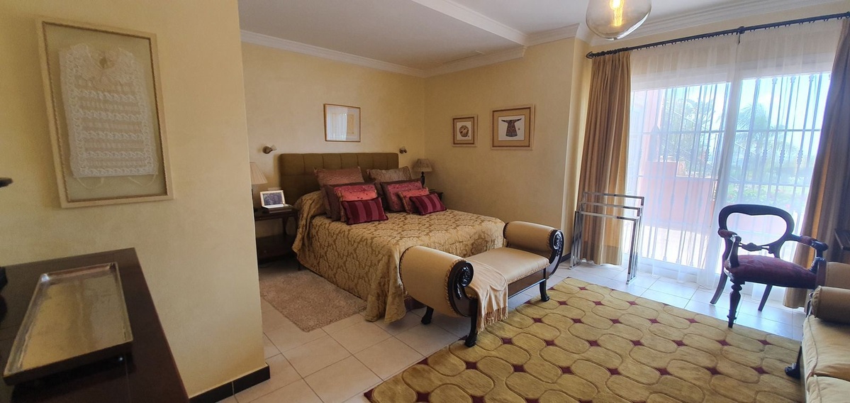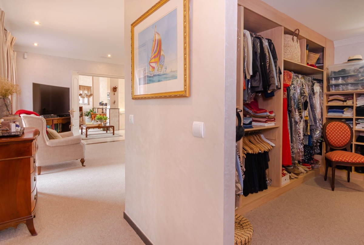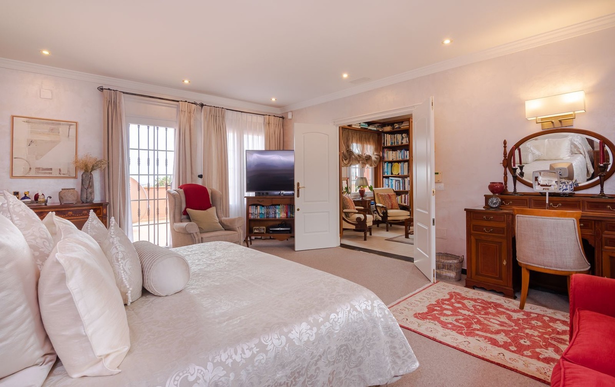 If we go up to the second floor we find a reception area that gives access to a large main room, completely private from the rest of the house, in it we have a bathroom with all the necessities en suite and a large L-shaped dressing room. Here we have access to a terrace with great views of the pool, sea, mountains of Mijas and golf course.