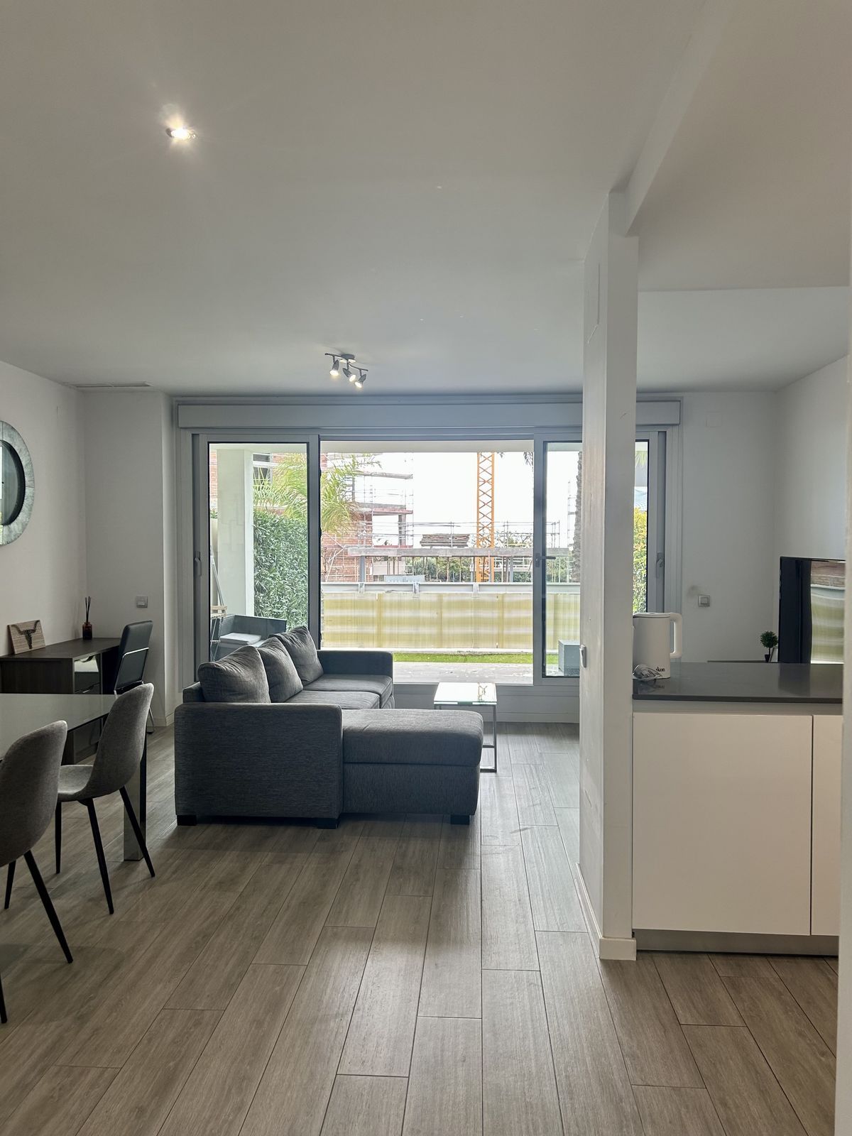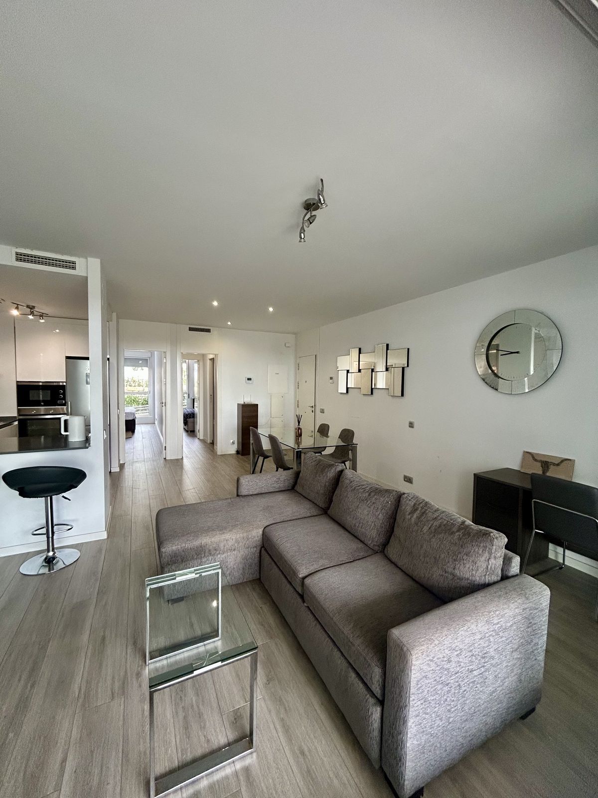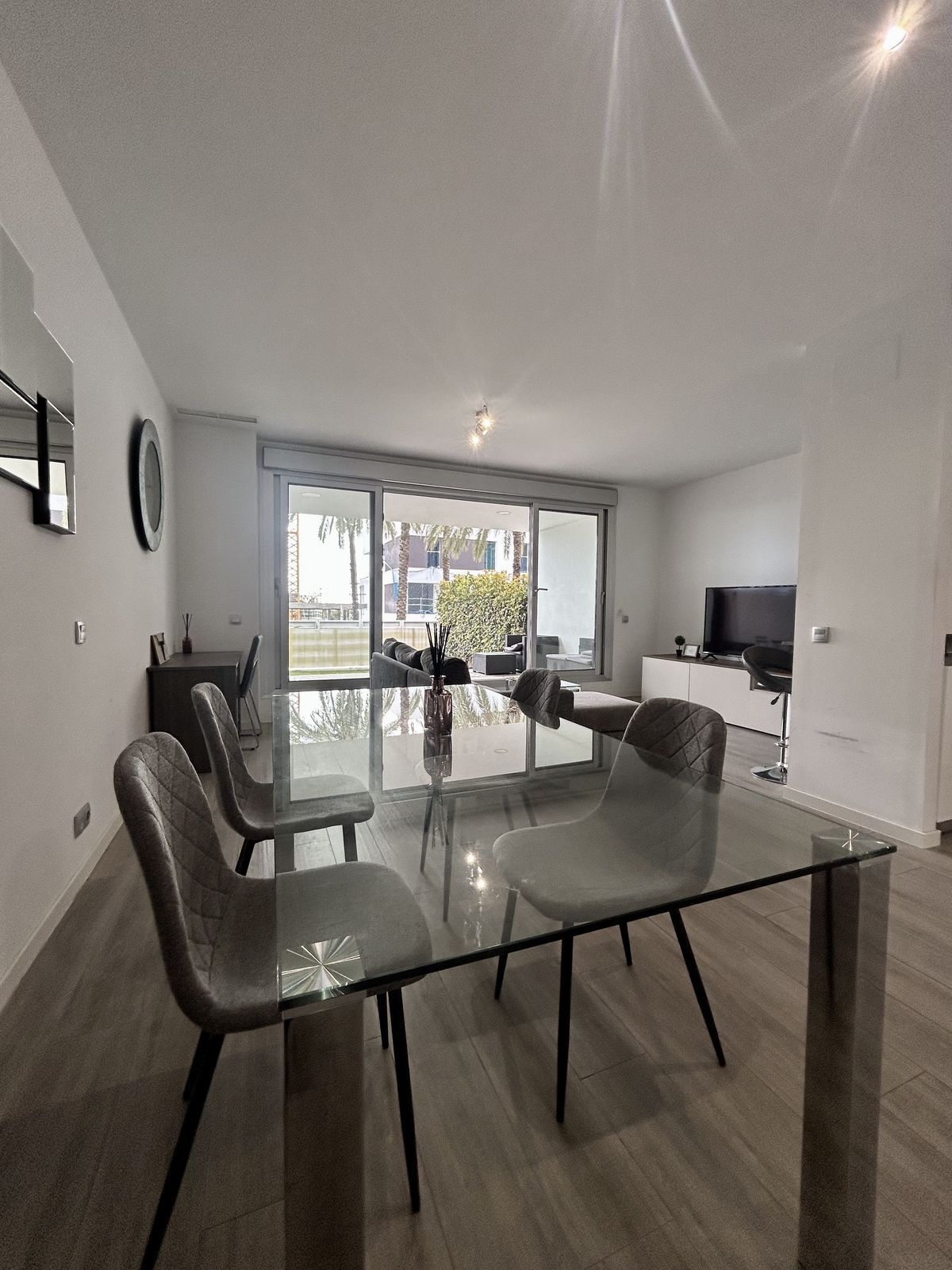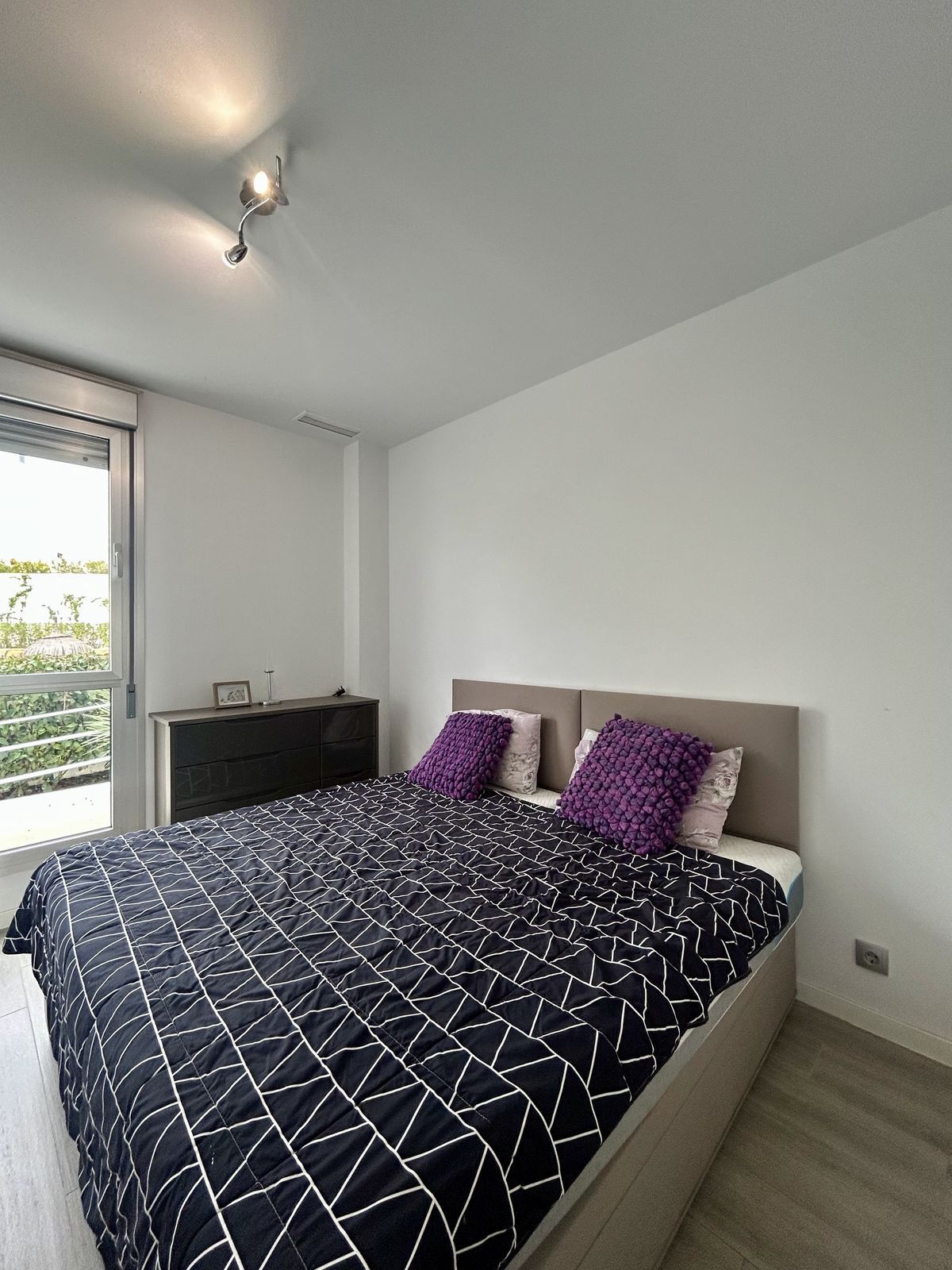 Modern apartment located in the charming village of Cancelada in Estepona. The garden apartment consists of a bright lounge and dining area have access to a private wouth facing terrace of 18 sqm and a garden of 30 sqm. The open plan kitchen is fully equipped with top range appliances. The 2 bedrooms have en-suite bathrooms and fitted wardrobes. The complex is gated with security services and concierge and has 2 swimming pools, kids pool and play area. Few minutes walking to shops, restaurants and services and only 5 minutes by car to the beach and Los Flamingos golf course.