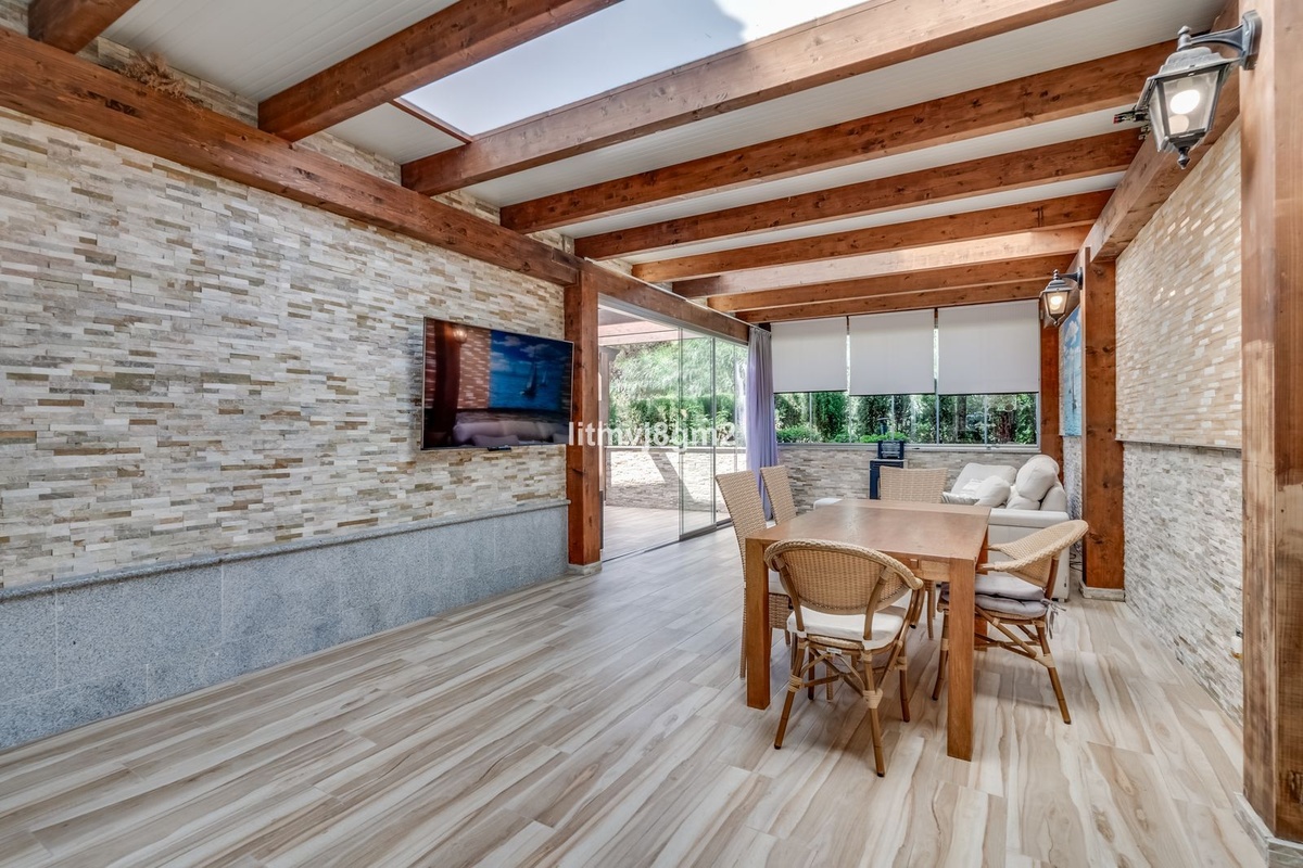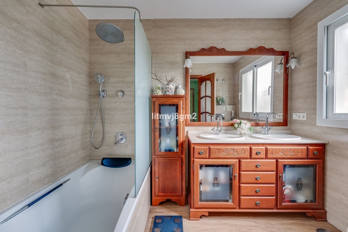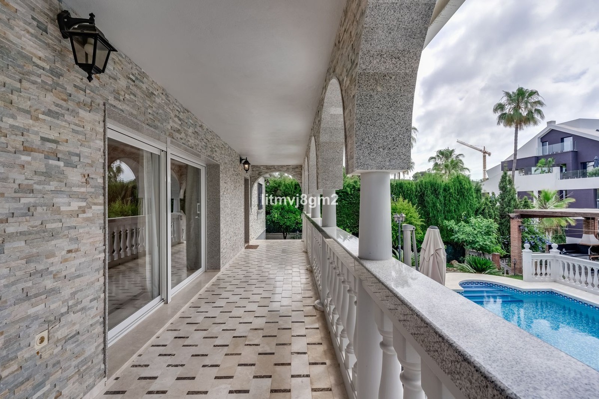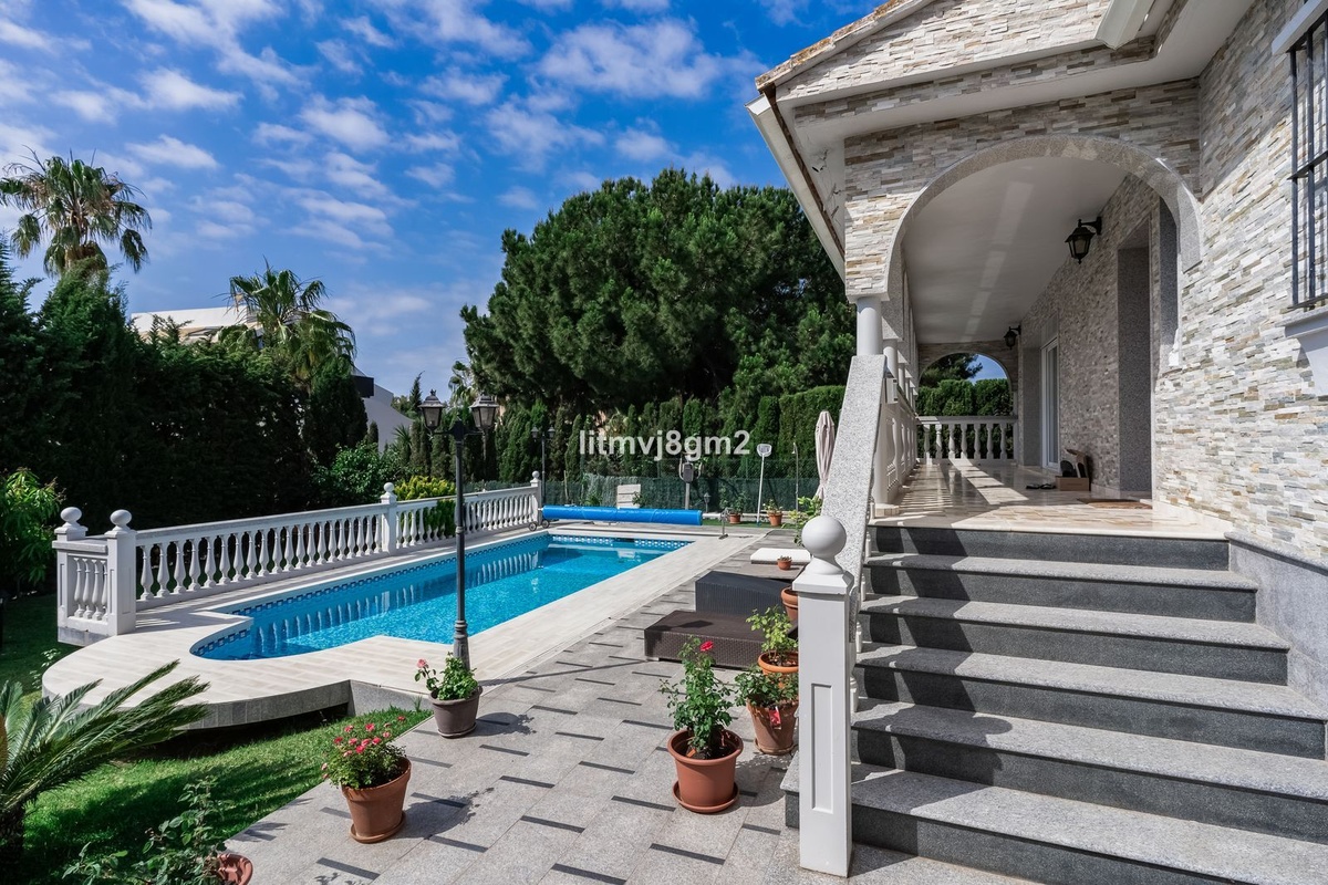This luxurious four-bedroom villa, located in the peaceful area of lower Artola / Hacienda Las Chapas, just 5 minuntes walk to the sea, is the epitome of elegance and comfort. Boasting a classic design with high-end finishes, the property features an abundance of marble, adding to its opulent charm. The interior is bathed in natural light, enhancing the meticulously crafted details throughout the home.