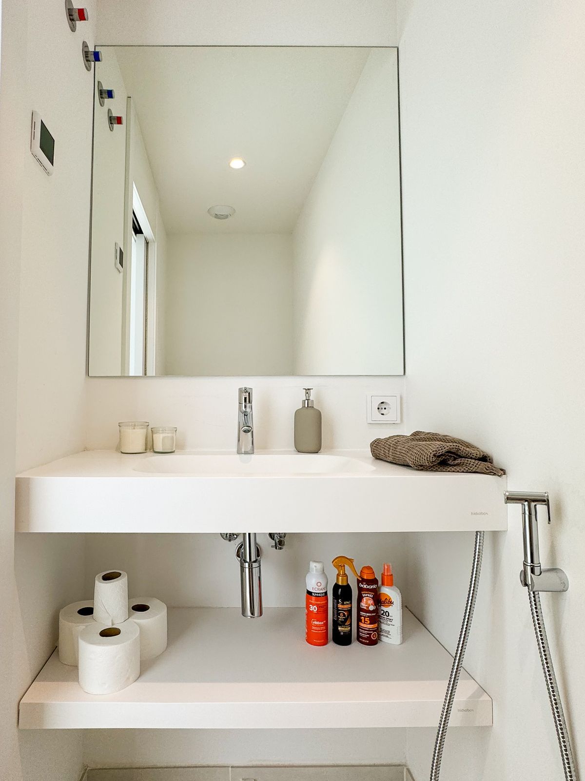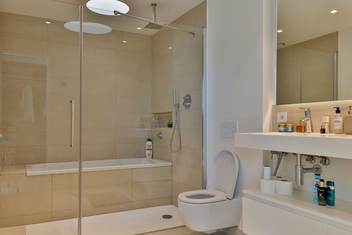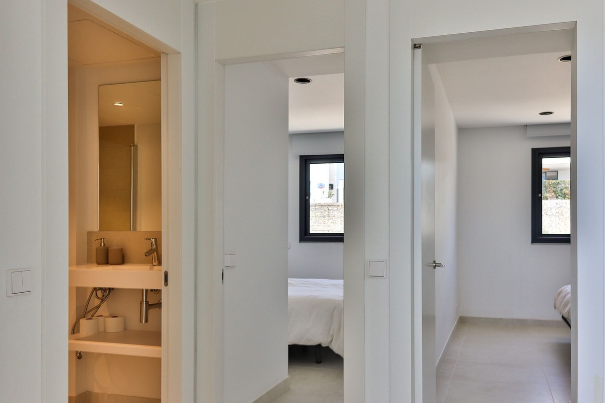 Large sliding doors create a seamless transition between indoor and outdoor living spaces, opening onto an impressive terrace where you will find a private plunge pool overlooking the sea — the perfect place to relax while enjoying the stunning coastal views. Automatic electric awnings and sun blinds provide shade during the warmer months, while underfloor heating throughout the property ensures year-round comfort.