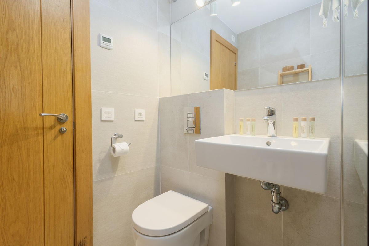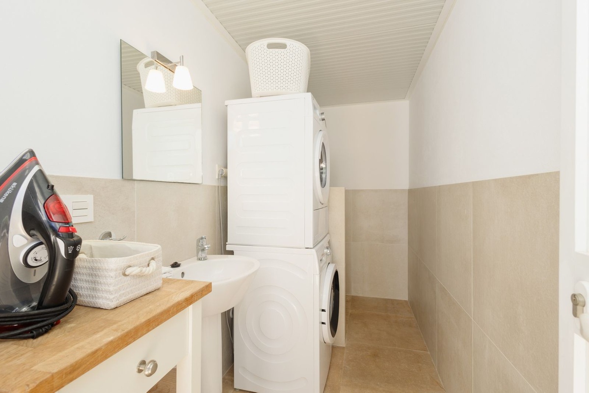 The bathroom is fully equipped with a shower, and there is also an outdoor toilet for added convenience, located in the garden area, where you’ll find a washing machine and a dryer.