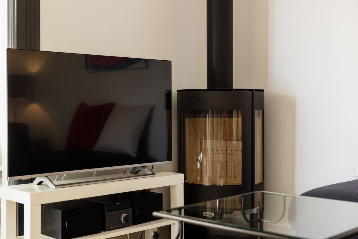 The open-plan kitchen is fully equipped with an oven, refrigerator, coffee maker, kettle, and all necessary cookware.