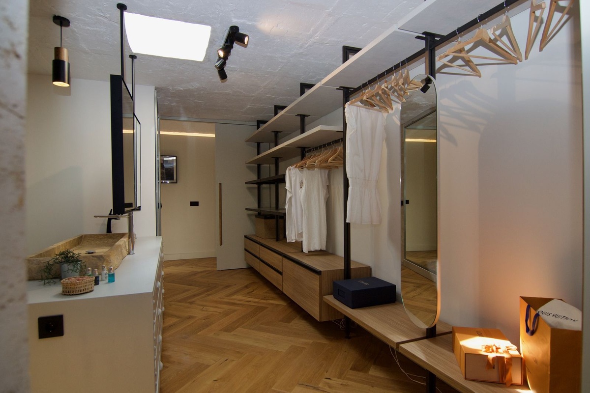 It features a large living room fully furnished with luxury designer furniture exclusive to this property, a fully equipped high-end kitchen, bedrooms with a very spacious dressing room, a generously sized modern bathroom, and a guest toilet.