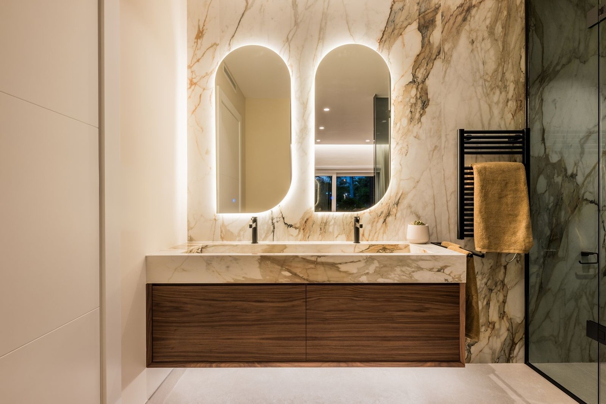 This stunning south-facing, totally renovated 3-bedroom, 3-bathroom ground floor apartment for sale on the New Golden Mile, Estepona, boasts impeccable quality and breathtaking views of the lush landscaped gardens.