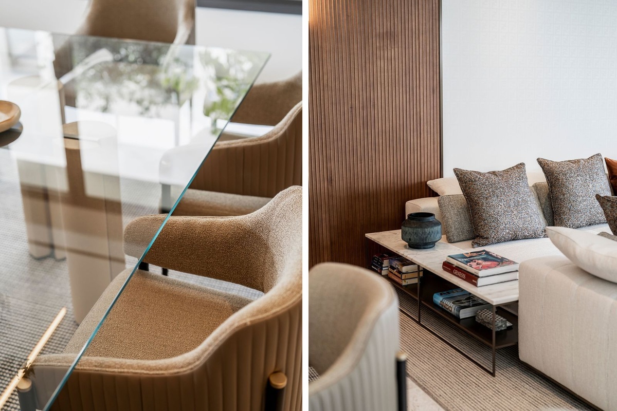 Interiors by GC Studio blend renowned Italian brands like Gallotti & Radice and Giorgetti with fine materials such as Carrara marble, natural stone, onyx, and genuine leather.