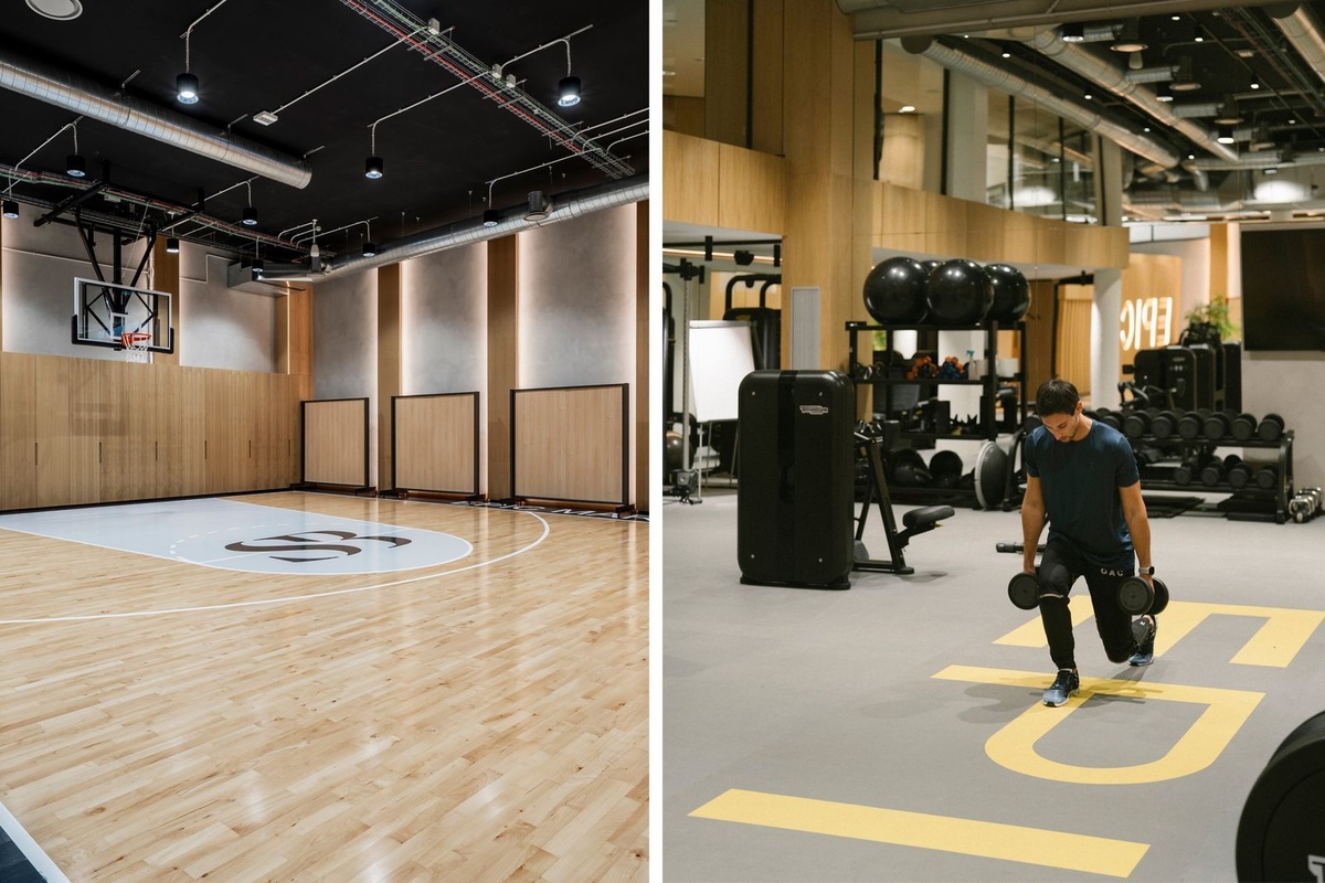 training equipment, golf simulator, boxing, yoga, and Pilates machines.