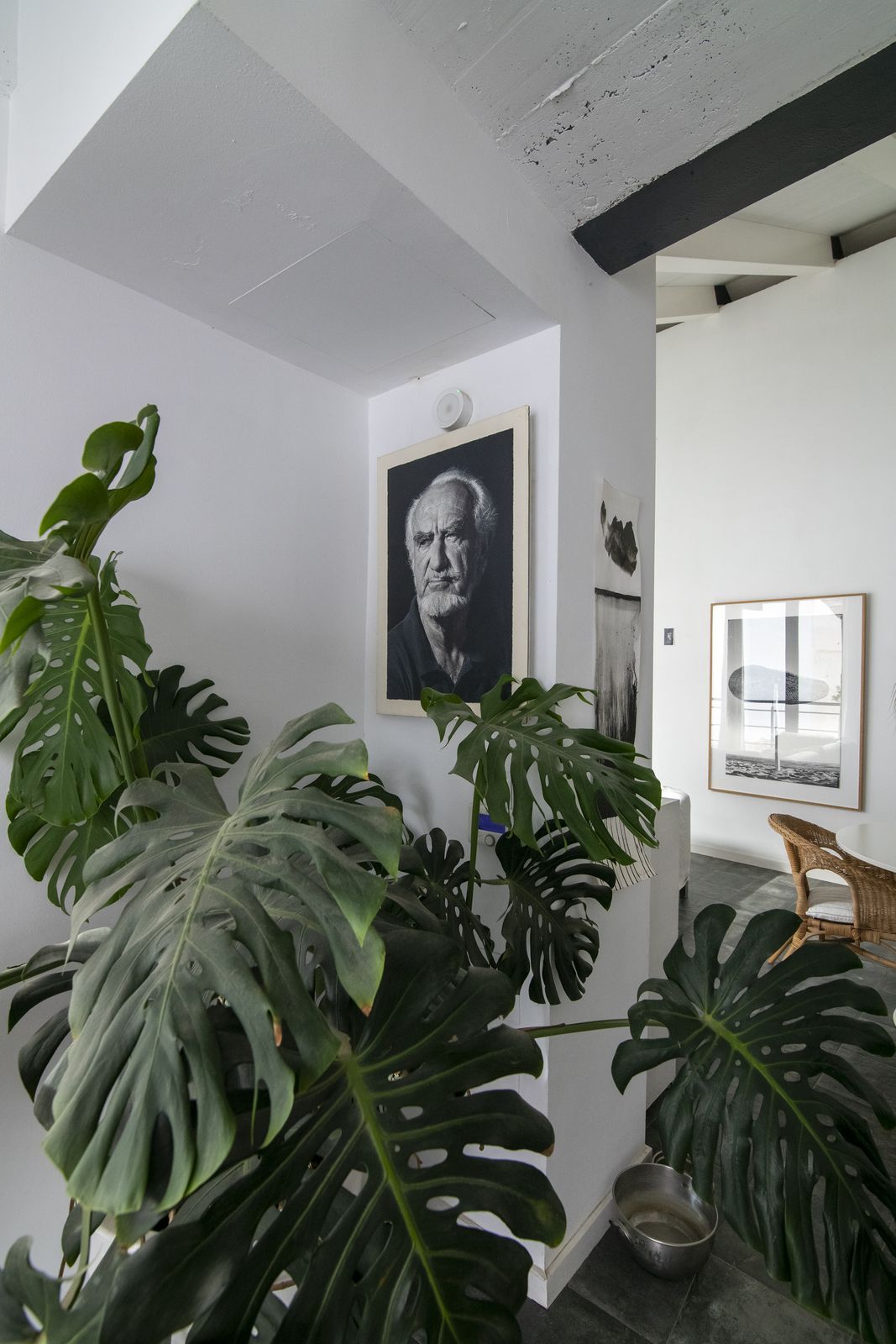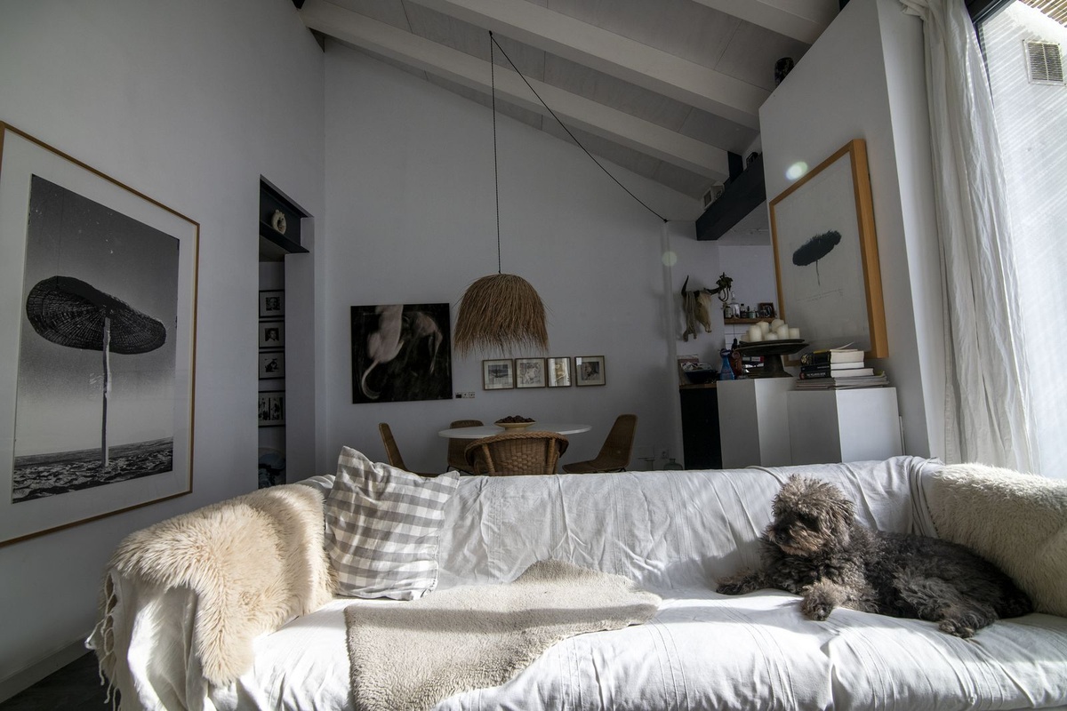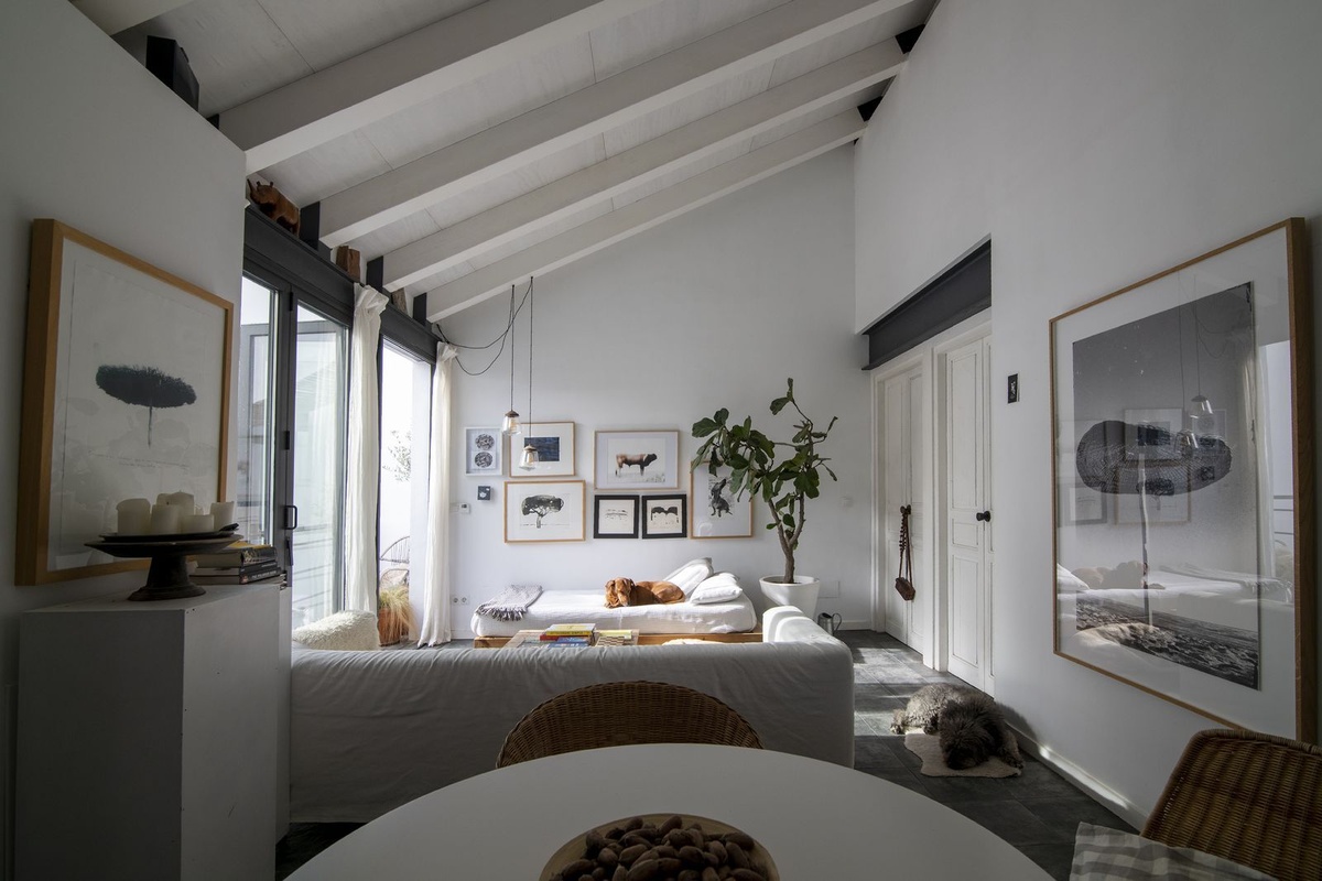 Upon entering, you are greeted by a spacious living area that is currently being used as an art gallery and entertainment space.