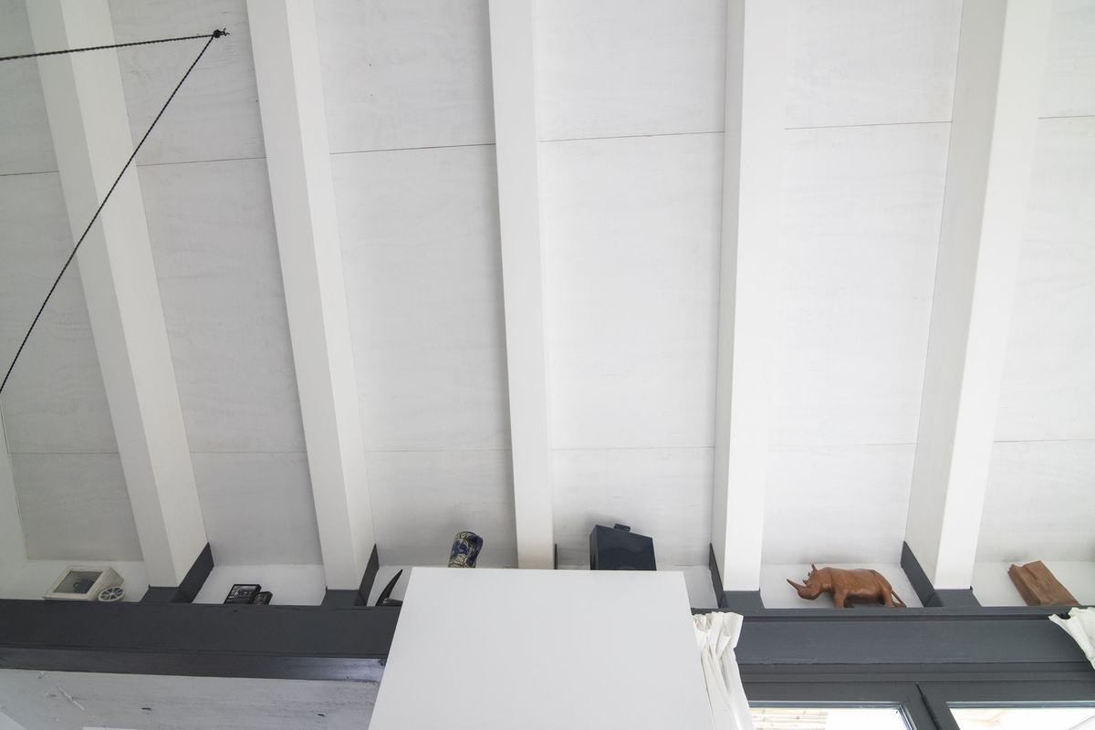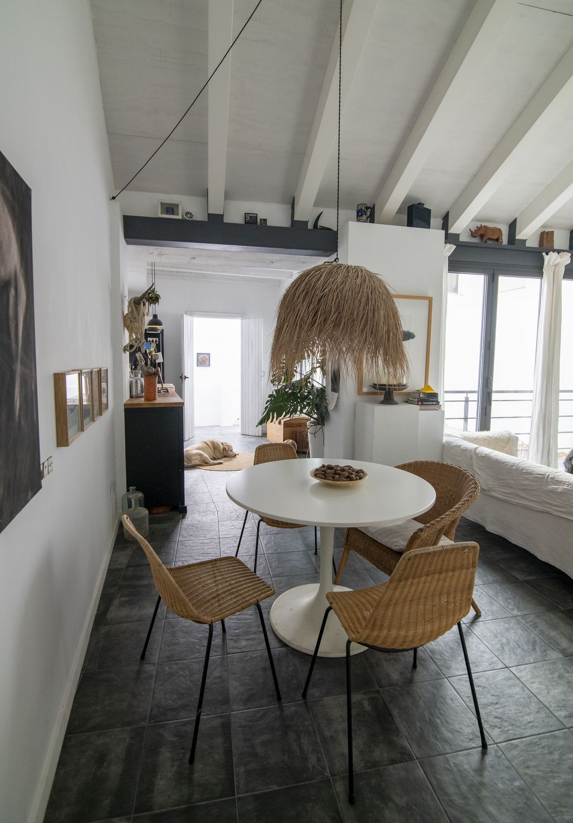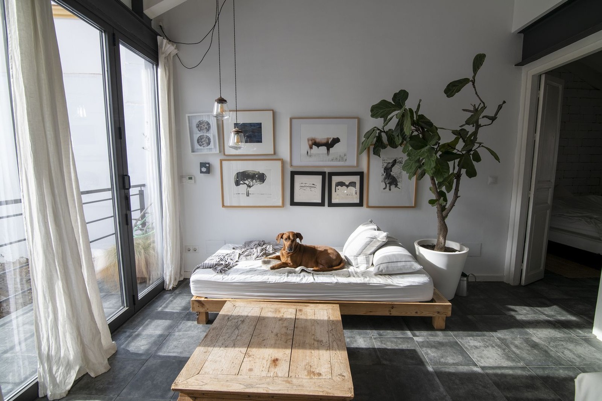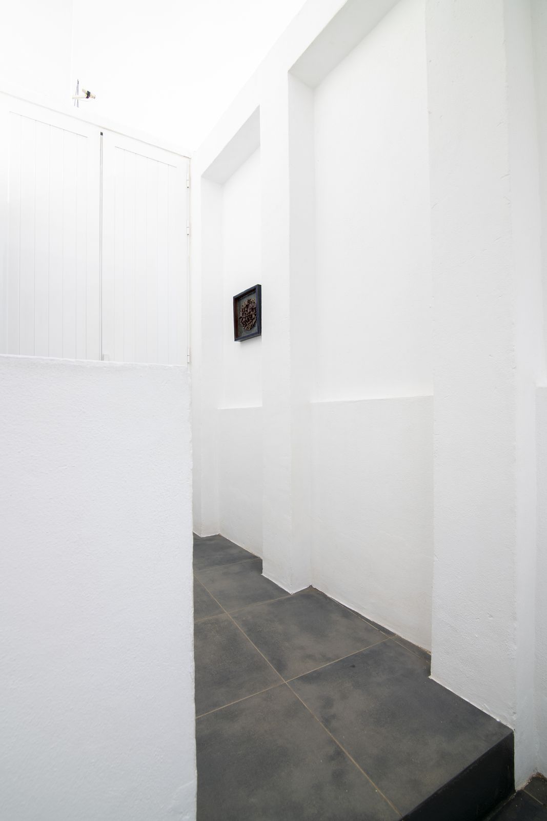 Upon entering, you are greeted by a spacious living area that is currently being used as an art gallery and entertainment space.