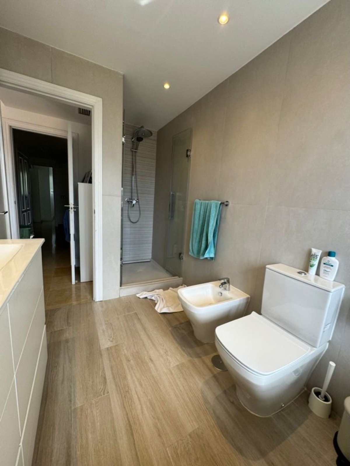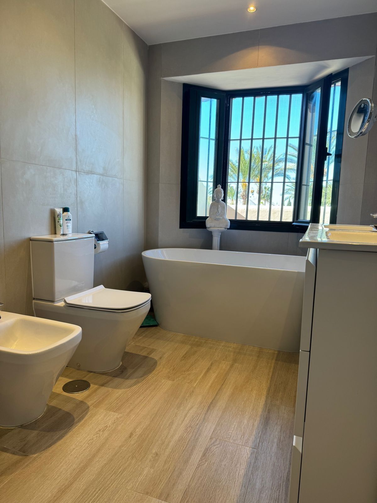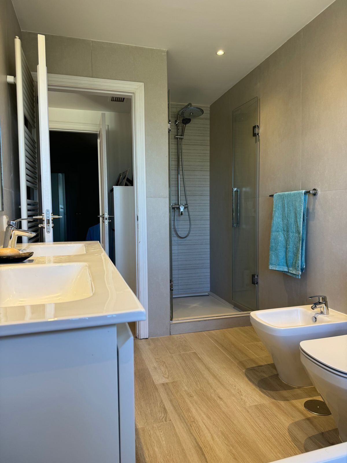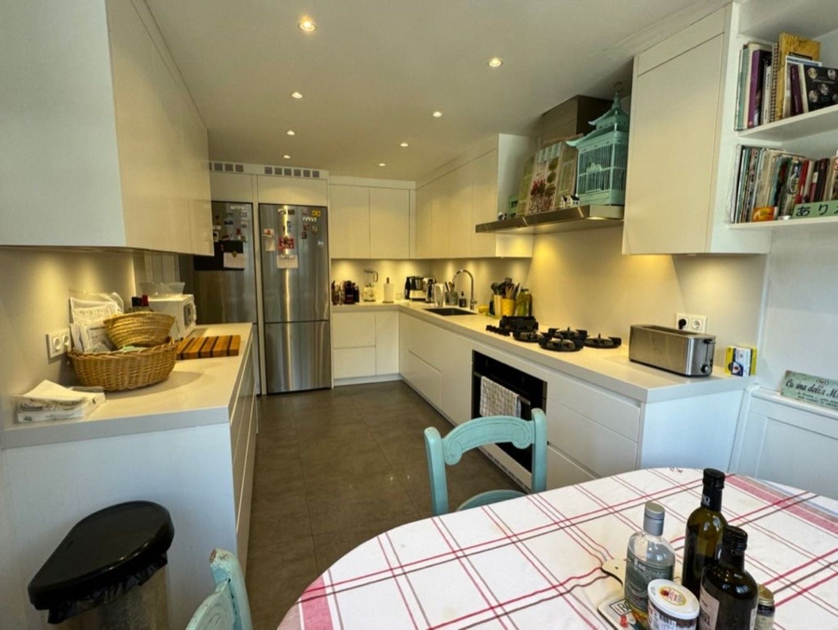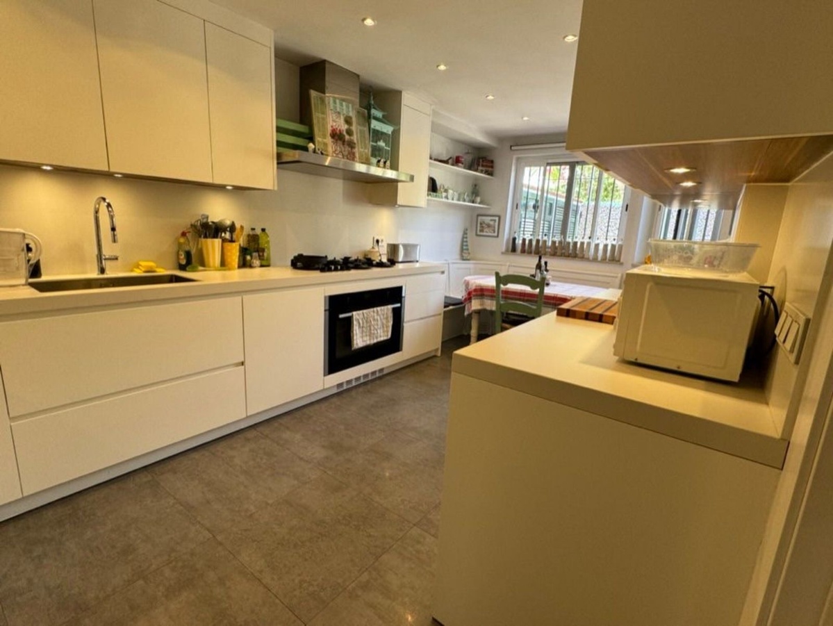 The townhouse is spread over three floors, in addition to a rooftop terrace, all finished to a high standard. On the ground level, you'll find a generously sized living and dining area that opens onto a spacious porch and a private garden, a fully equipped kitchen, and a guest bathroom. The first floor hosts the master suite, complete with an en suite bathroom and a private terrace, as well as two additional bedrooms, each with their own balcony, sharing a bathroom. The rooftop terrace is a real highlight, offering a built-in barbecue and breathtaking sea views.