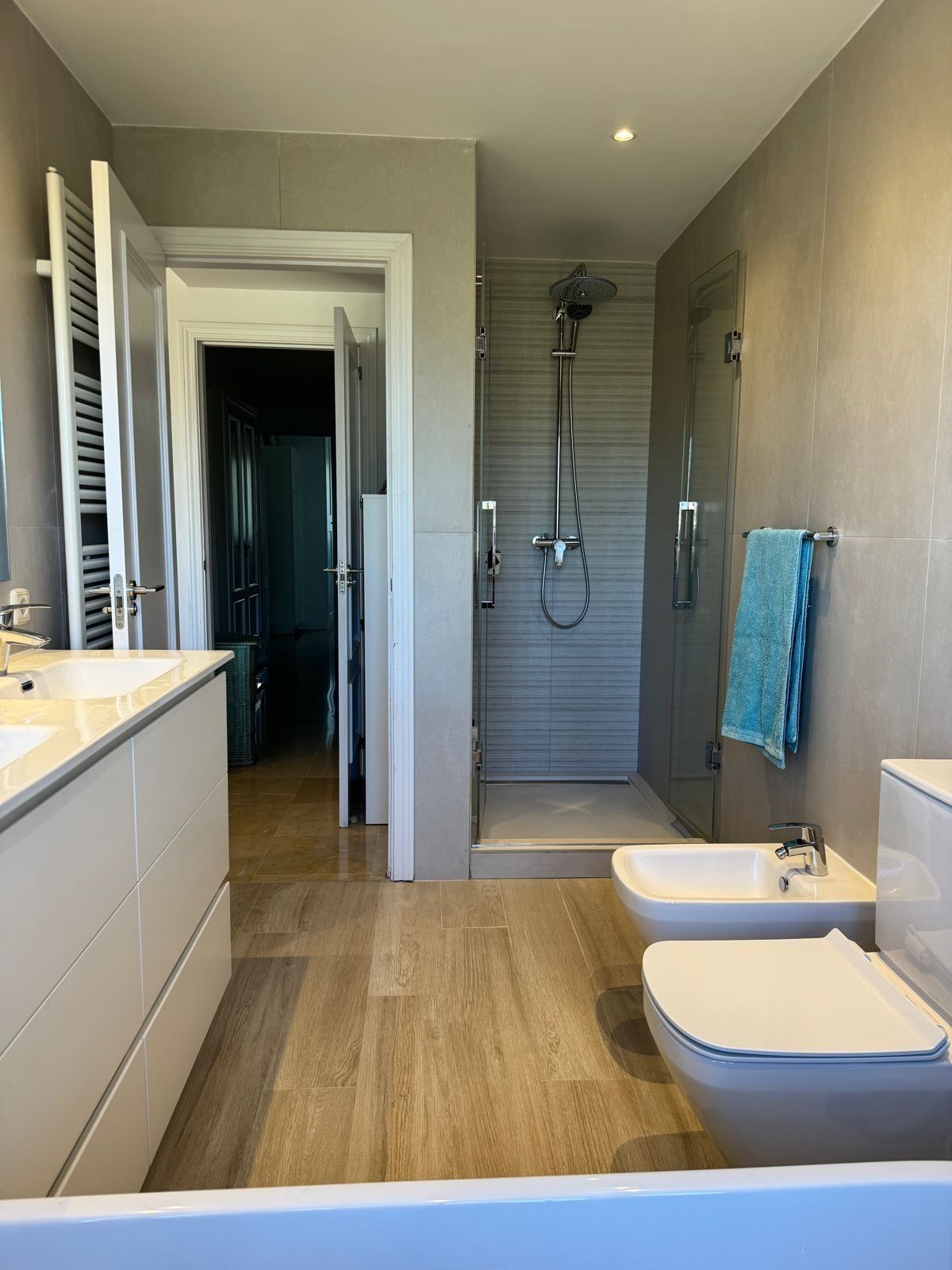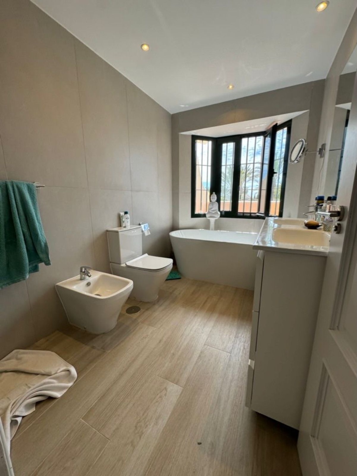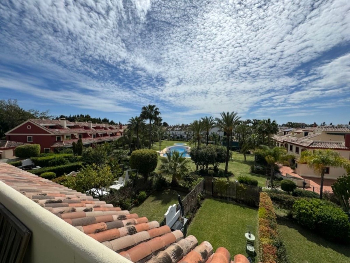 This south-facing townhouse is located in the prestigious Golden Mile area of Marbella, a stone's throw away from the luxurious Puente Romano and Marbella Club hotels, along with their exclusive beach clubs. It's also conveniently close to the heart of Marbella and the chic Puerto Banus. Set within a securely gated community that merges modern design with classic Mediterranean flair, this property is surrounded by beautiful, lush gardens featuring palm trees and offers access to two swimming pools.