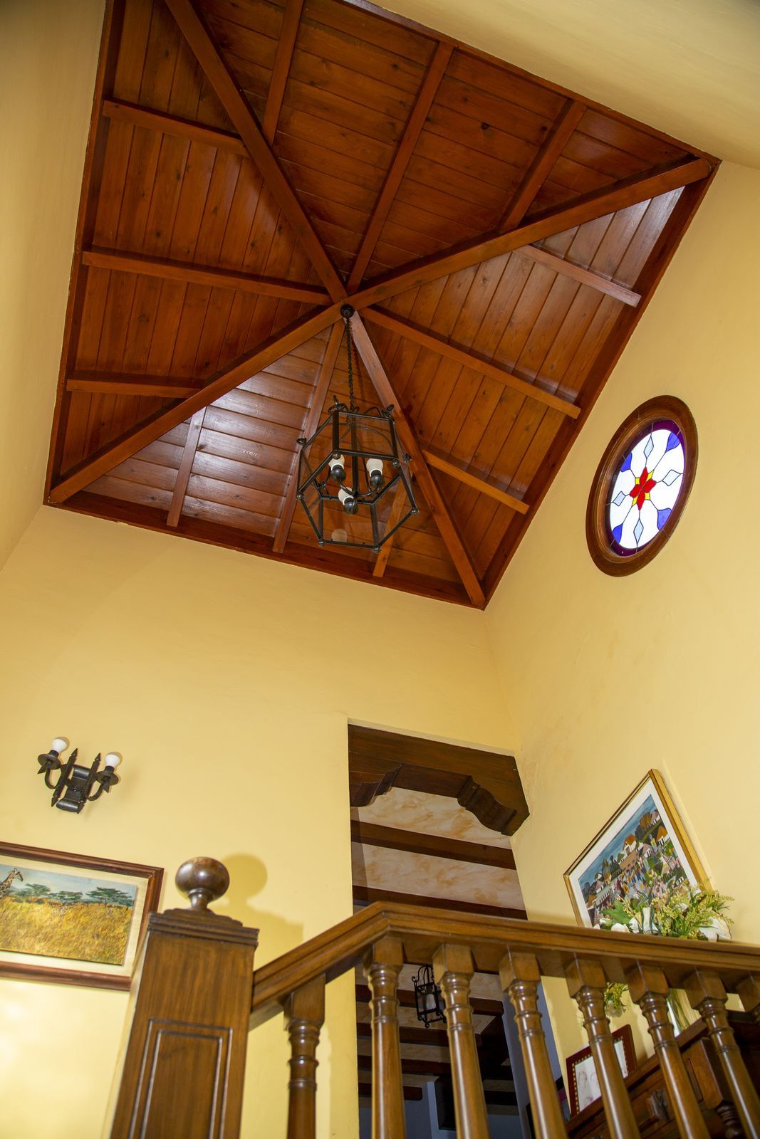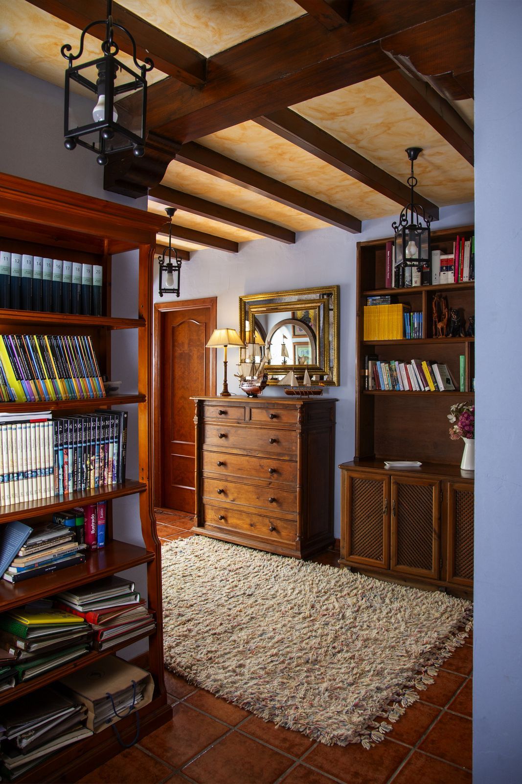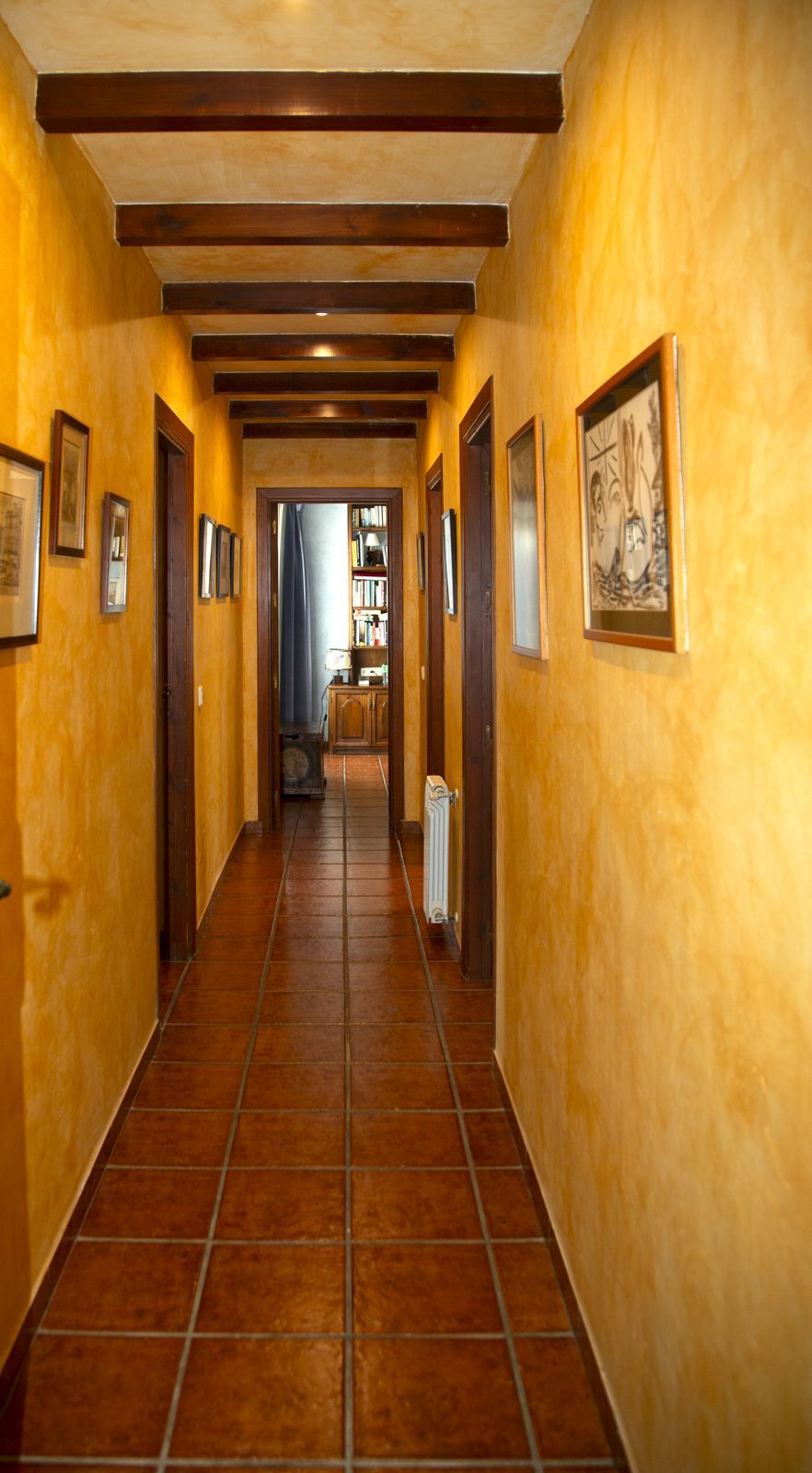 On the upper floor, going up the stairs, with a spectacular coffered wooden ceiling in the form of a tower, there is a large hallway that leads to 2 bedrooms with access to the terrace, a bathroom and a large office/library room that can be used for different purposes depending on the needs.