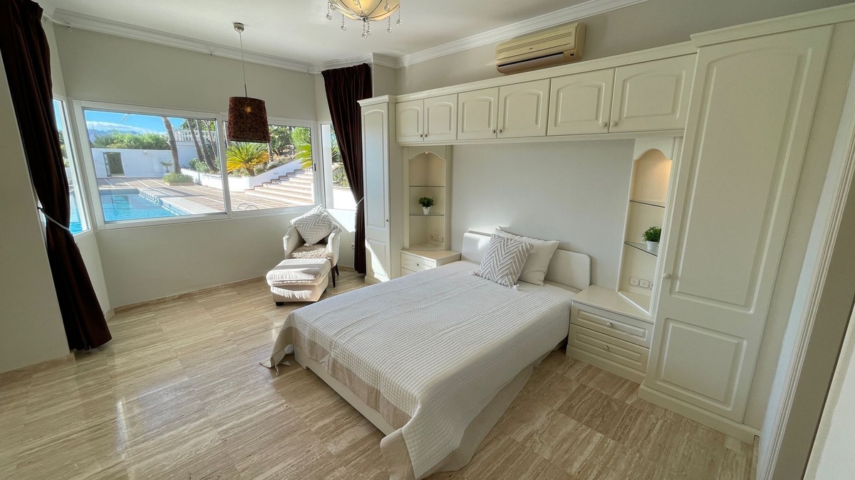 The private 12 x 20 meter swimming pool is truly magnificent, with a uniform depth of 1.60 m, there is a raised platform with sun loungers for the ultimate experience in relaxation. The self-contained guest house has views and direct access to the beautiful swimming pool. Lovely covered porch. It consists of a central lounge with open-plan fitted kitchen. Air conditioning hot & cold. Two bedrooms, both en-suite, with plenty of cupboard space.