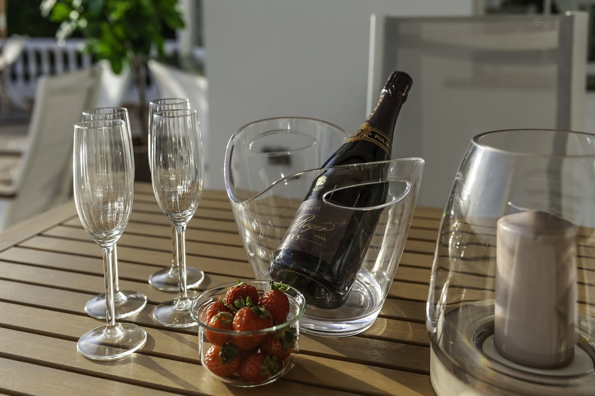 It has three elegantly decorated bedrooms, each with a double bed and two stylish bathrooms. A spacious living room includes a fireplace and a lounge area for dining and socializing.