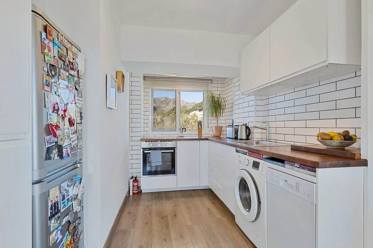 Large open-plan fully fitted kitchen with washing machine and dishwasher and dining area through to large living room with panoramic sea views across to Málaga and as far as Nerja.