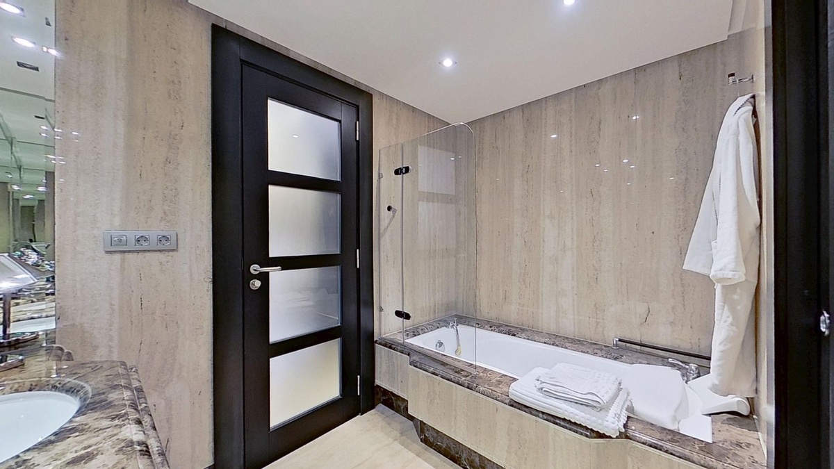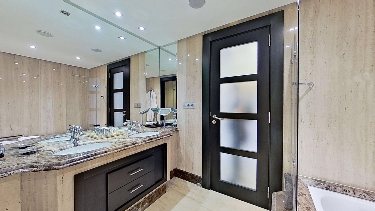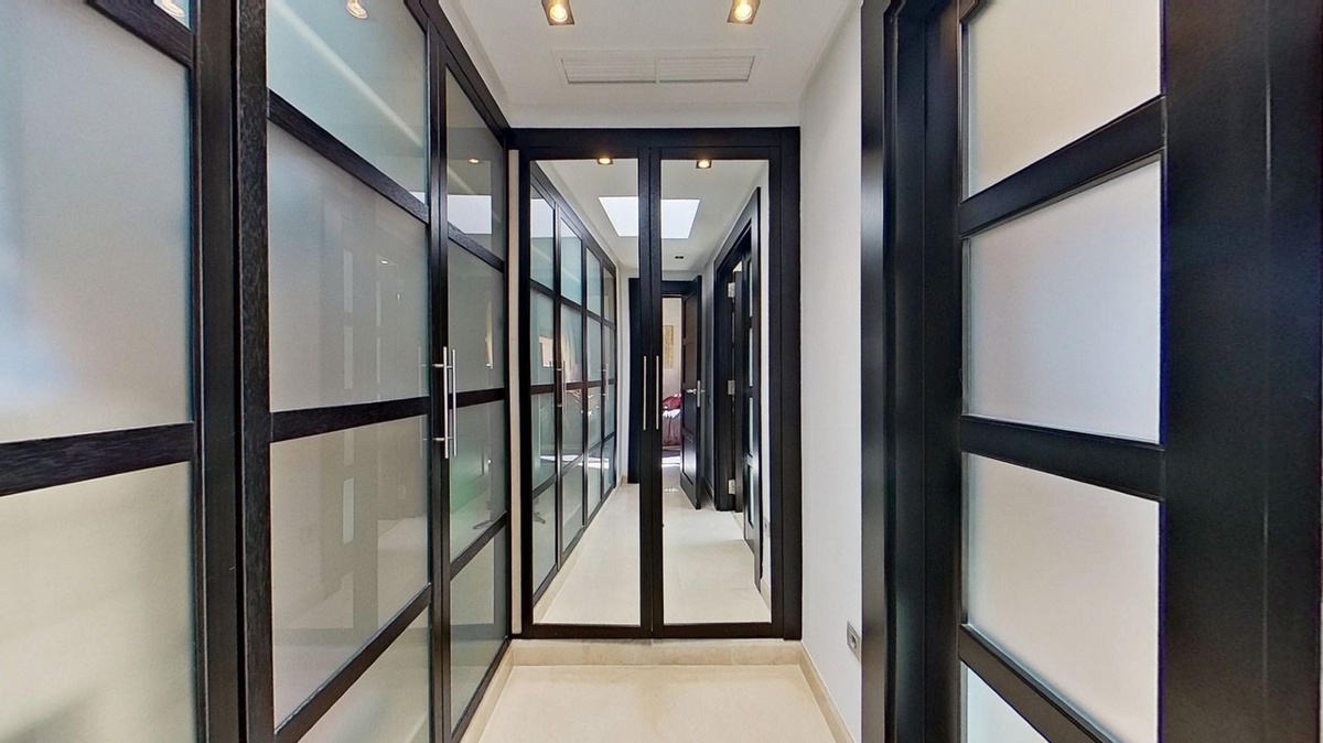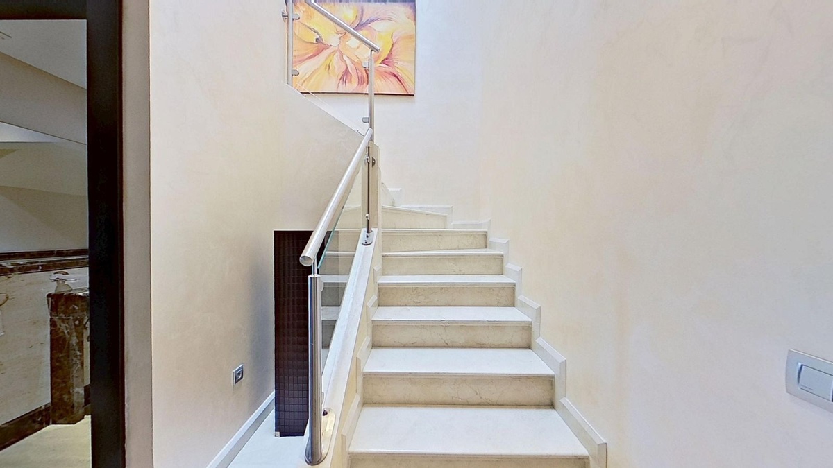 This large duplex apartment has three spacious en suite bedrooms, with build-in wardrobes. The master bedroom, located upstairs, has furthermore a private terrace. The finishings include cream marble floors, underfloor heating, and travertine marble bathrooms and sauna in the master bedroom. The property has been maticulously maintained and is well presented in all areas. In addition, the property has two ample garage spaces and a storeroom included in the price.