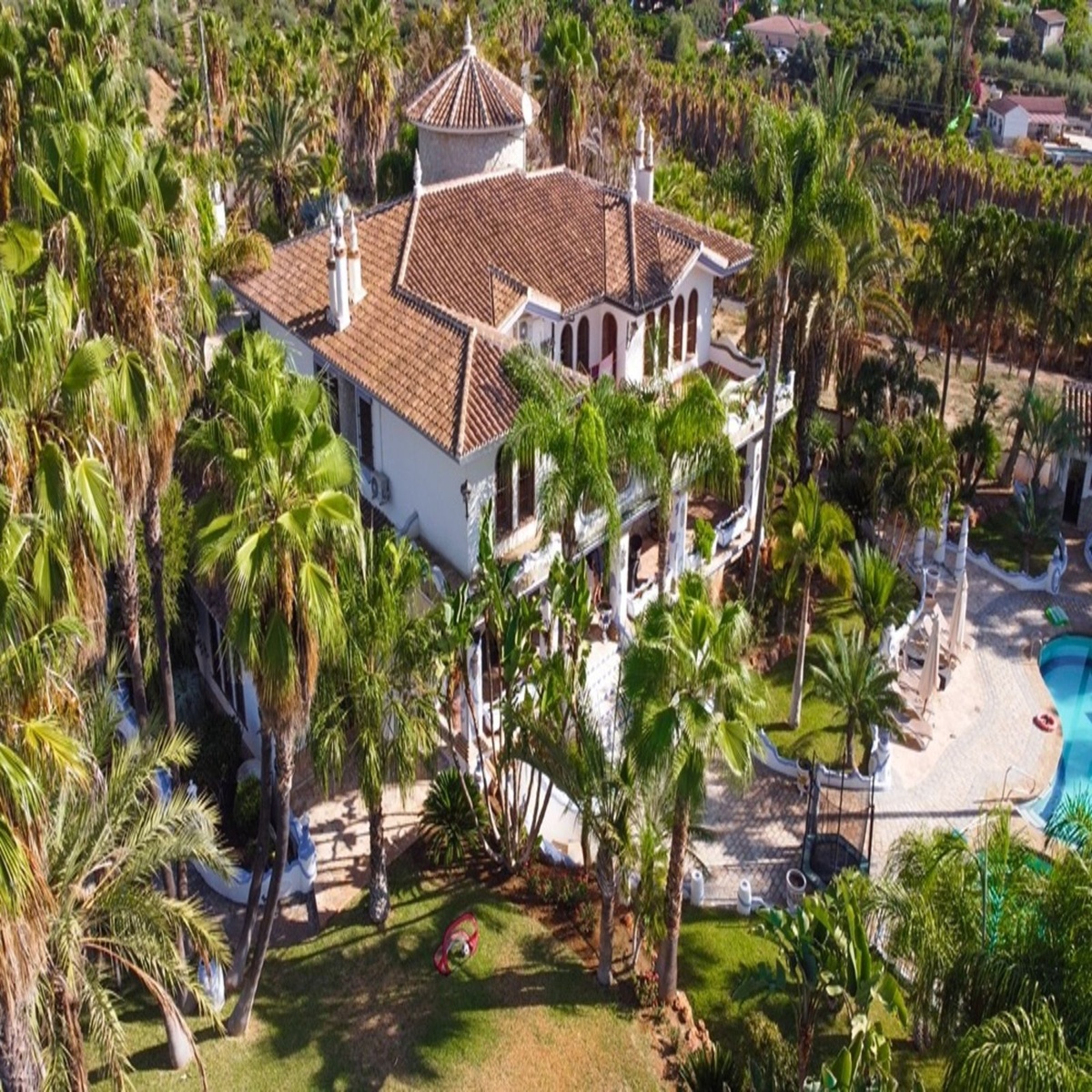 Basement: A small wine cellar, a recreation room with a bar, a billiard room, two small bedrooms, and an office. From there, you can directly access a connection to the two machinery rooms for the pool and the irrigation system for the entire property.