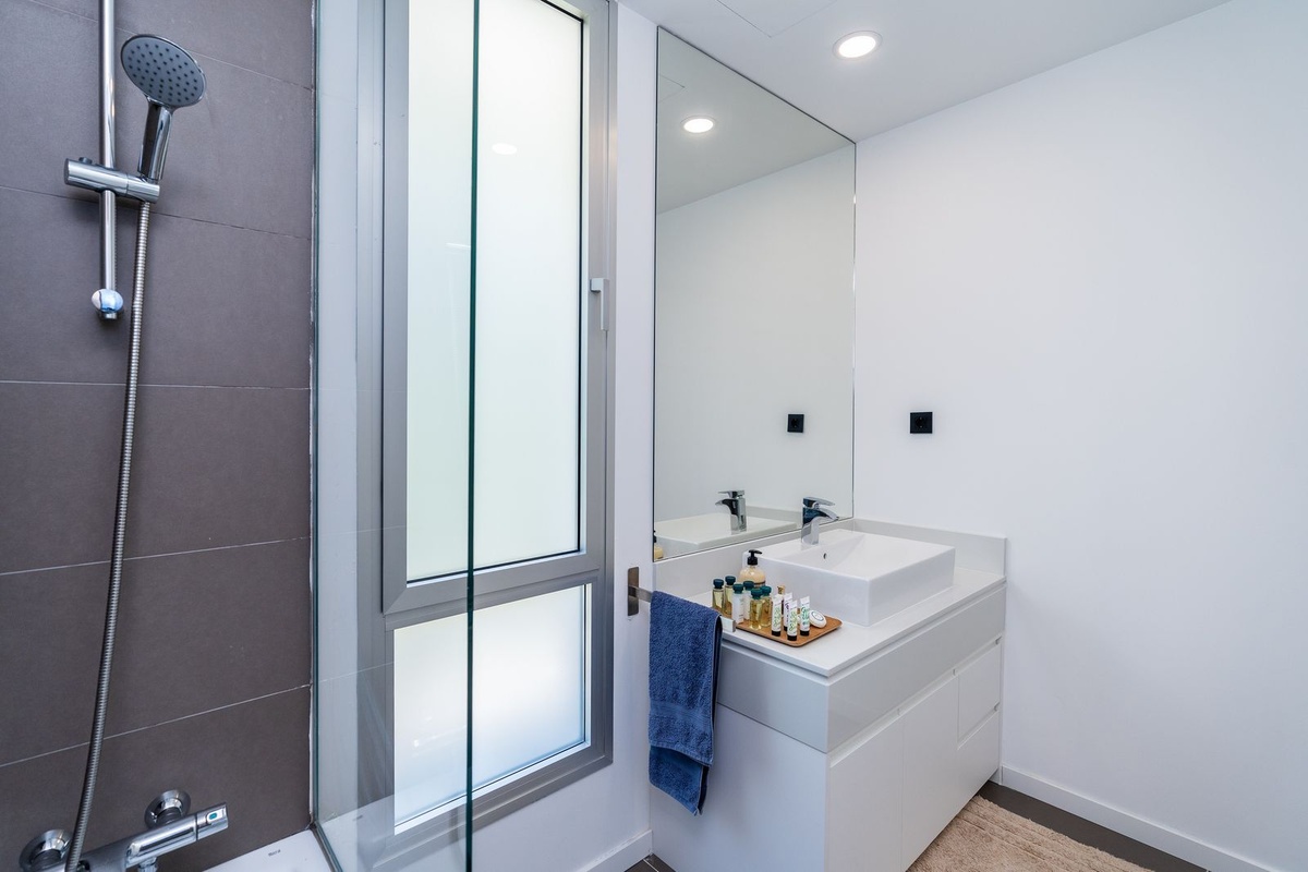 On the main floor, you´ll find an open-plan kitchen with a central island finished in exposed concrete for an elegant industrial touch, seamlessly connected to a bright living-dining area.