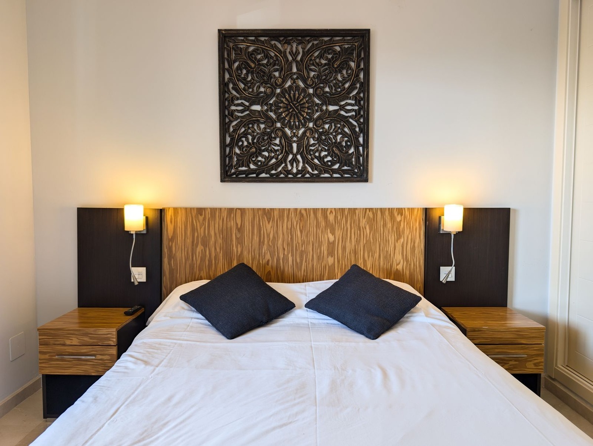 The apartment is flooded with natural light, enhancing the open and airy feel throughout. The master bedroom features an ensuite bathroom, while the spacious second bedroom provides additional comfort. Enjoy delightful meals at the onsite restaurant, offering mouth-watering Mediterranean cuisine that perfectly complements the relaxed, upscale lifestyle.