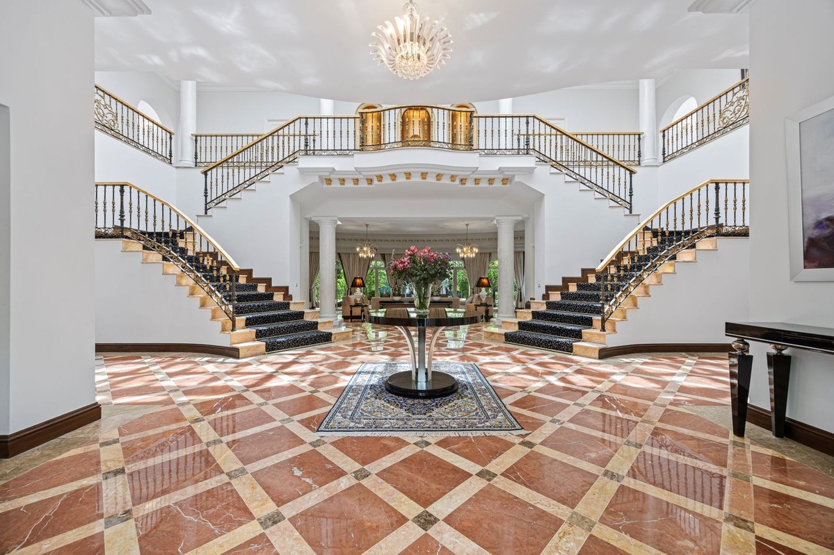 From the moment you arrive, the home makes a statement. Grand Doric columns frame the entrance, and ivy-covered walls soften the architecture, giving it a quiet, almost cinematic beauty. The double-height entryway, with its sweeping twin staircases and patterned marble floor, sets the tone: formal but warm, impressive yet inviting.