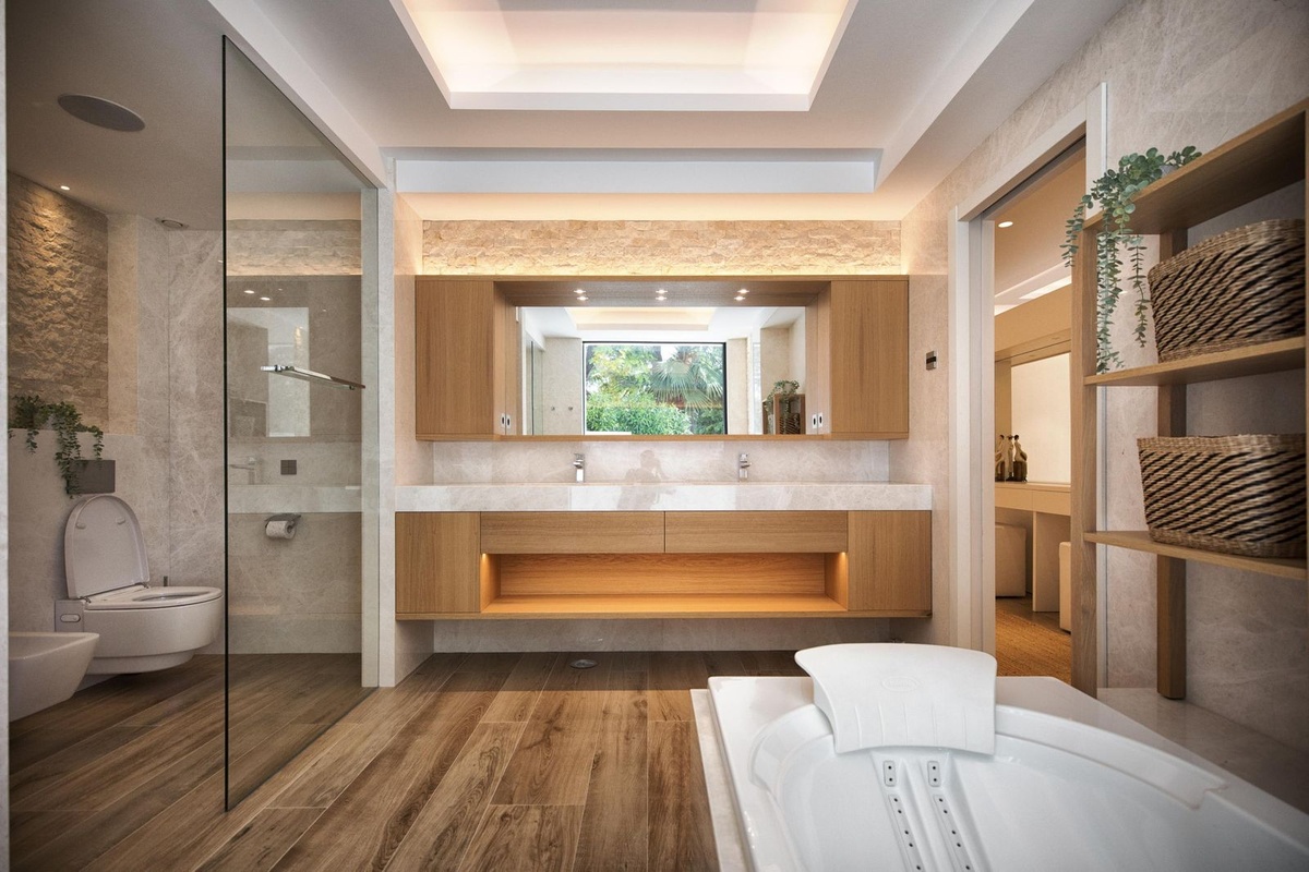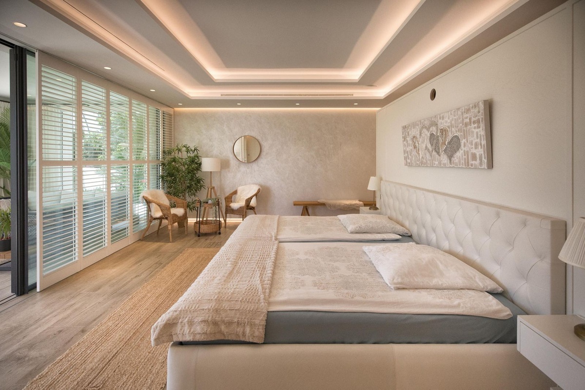 Built with eco-friendly principles, the villa incorporates the latest advancements in home automation, underfloor heating with parquet floors, and sophisticated ceiling designs. Energy-efficient LED lighting and air conditioning systems are seamlessly integrated, and high-speed internet and Wi-Fi connectivity are available throughout the property. Large fitted wardrobes, expansive glass doors, and tasteful design elements add to the home’s functionality and aesthetic appeal.