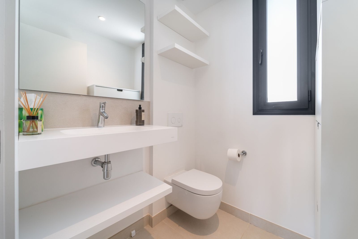 The master suite features an open-concept bathroom, while all three bedrooms include built-in wardrobes and electric curtains for a seamless lifestyle. Additional features include underfloor heating in all bathrooms, air conditioning (hot and cold), video intercom, domotic system, and pre-installation for an alarm system.