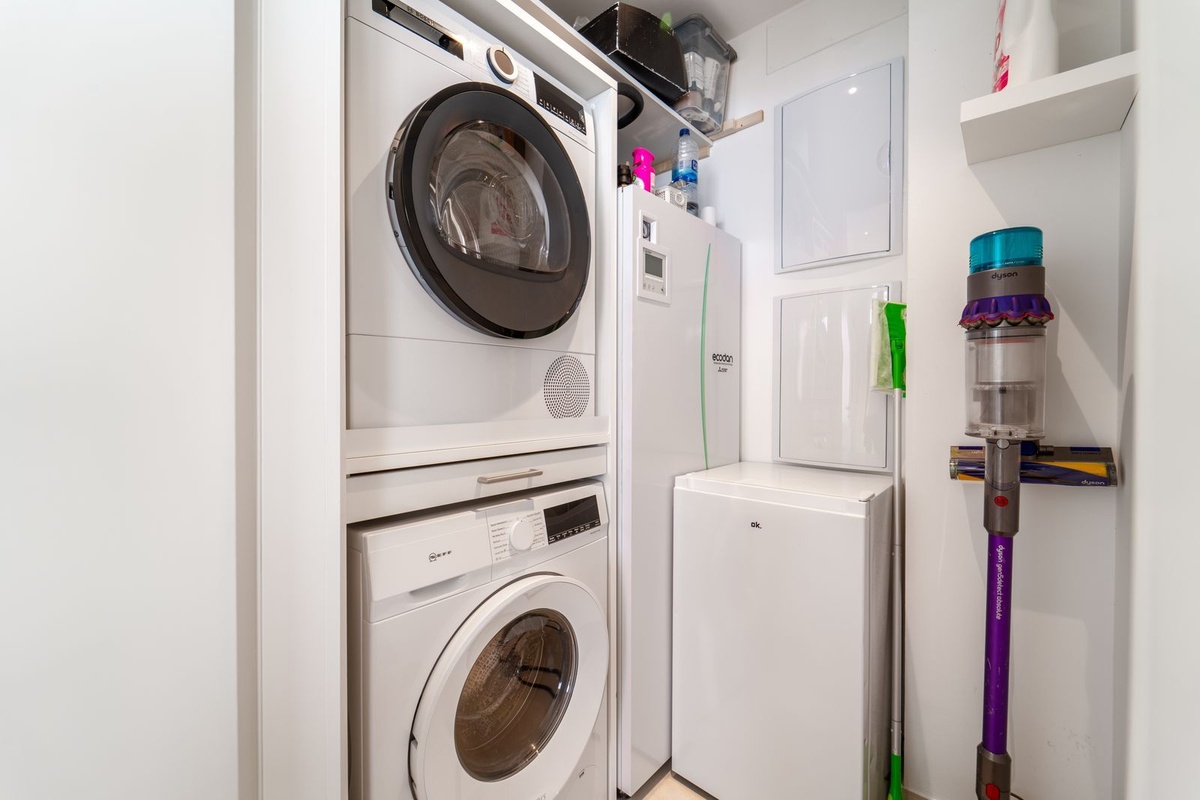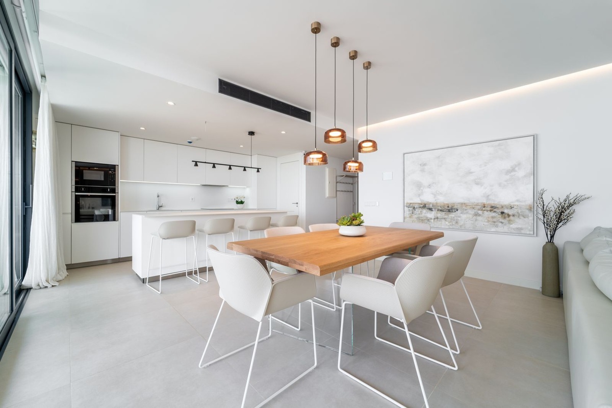 The property boasts a bright and spacious living-dining area with floor-to-ceiling windows that open up to a generous 41m² south-facing terrace, offering breathtaking panoramic views of the sea and surrounding mountains. The open-plan kitchen is fully furnished and equipped with high-end appliances, while a separate utility area includes a washer and dryer for added convenience.