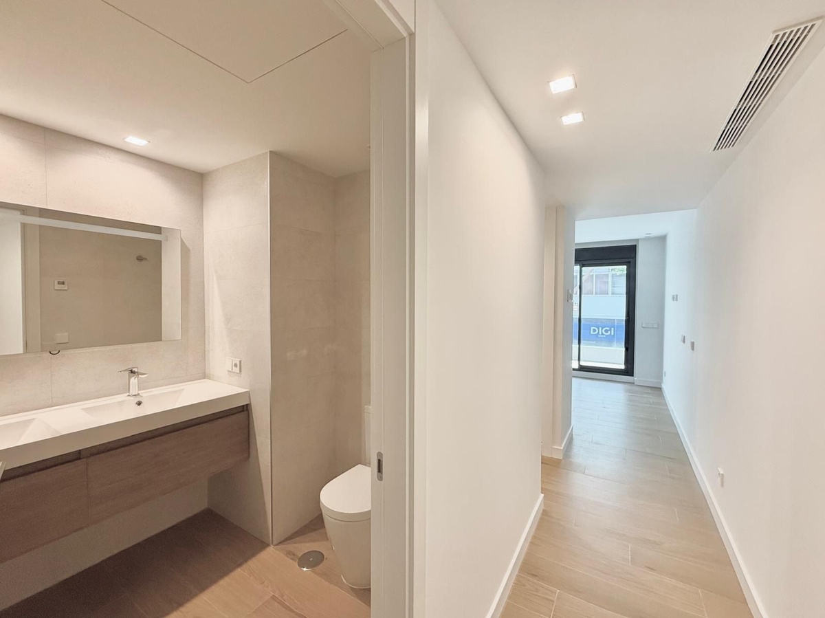 The bright and expansive living-dining area opens onto one of the two private terraces, perfect for enjoying the Mediterranean climate year-round. The apartment includes three bedrooms: the master suite features a walk-in wardrobe and en-suite bathroom, while the other two bedrooms have access to the rear terrace and come with fully fitted built-in wardrobes. There is also a second large, modern bathroom.
