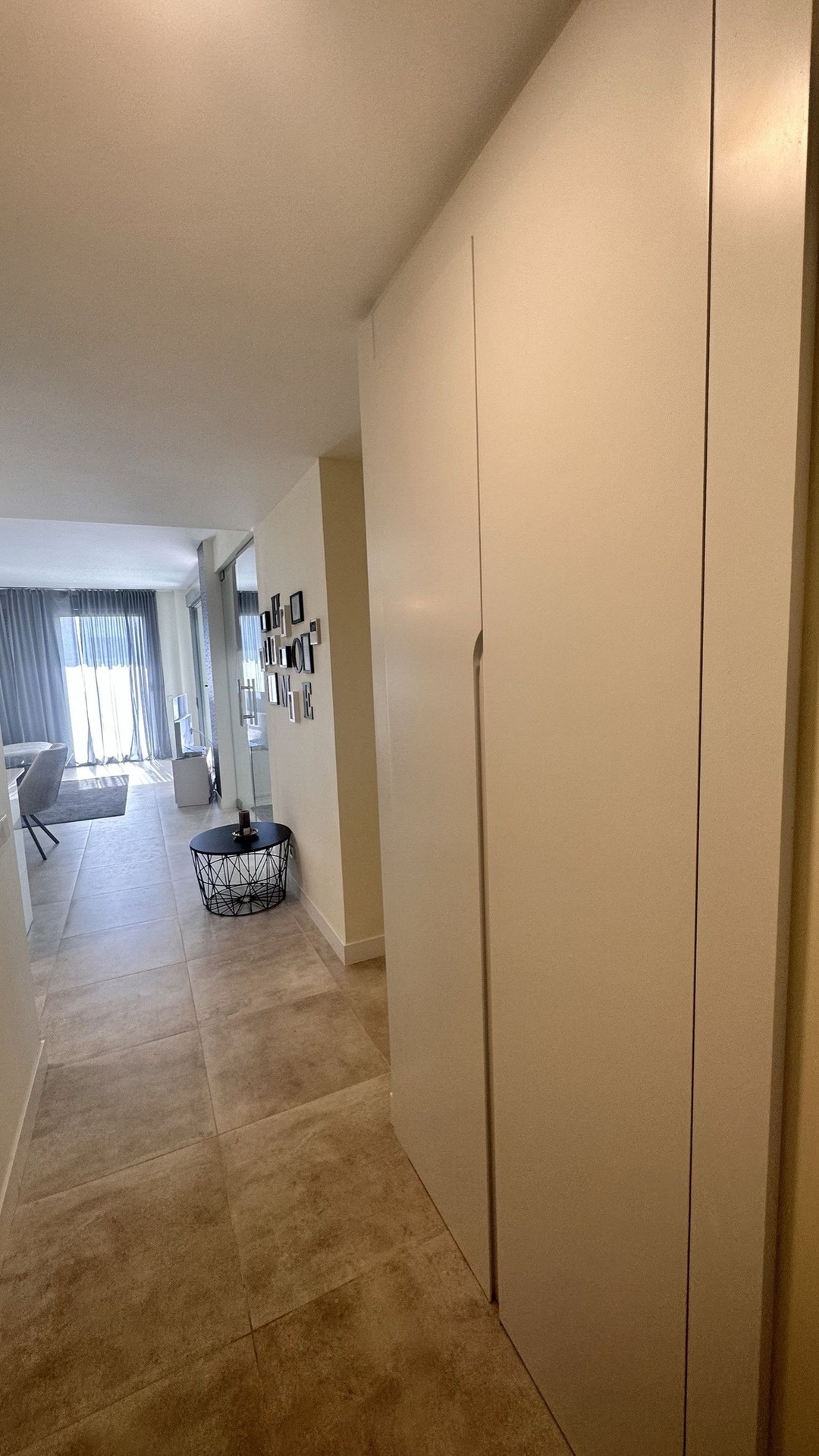 Situated on the first floor, this fully furnished apartment features an elegant living room that opens to a terrace, offering lovely views of the pool area and garden. It includes a modern, fully equipped kitchen, two double bedrooms with en suite bathrooms, fitted wardrobes, and balconies. Additional amenities include a laundry area, a parking space in the underground car park and a storage room.