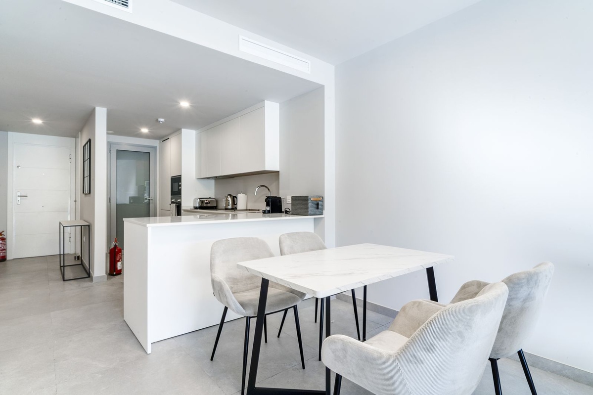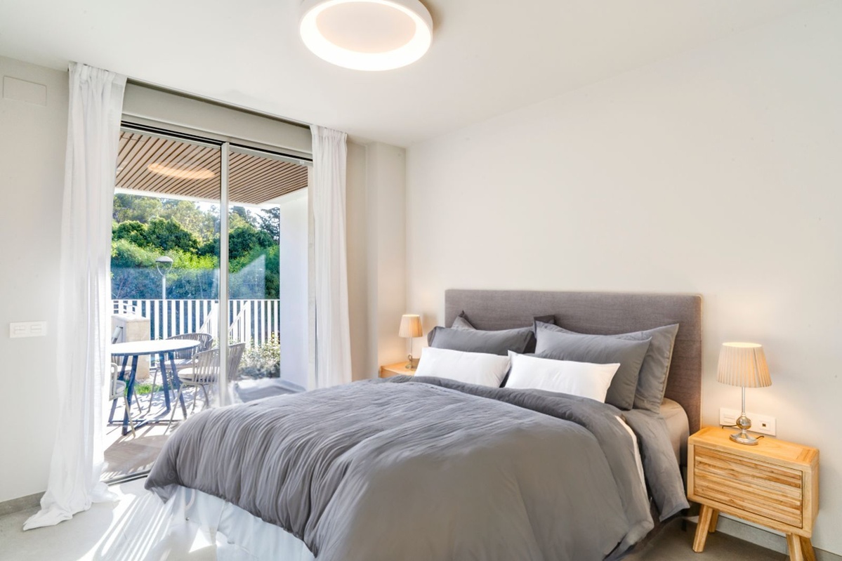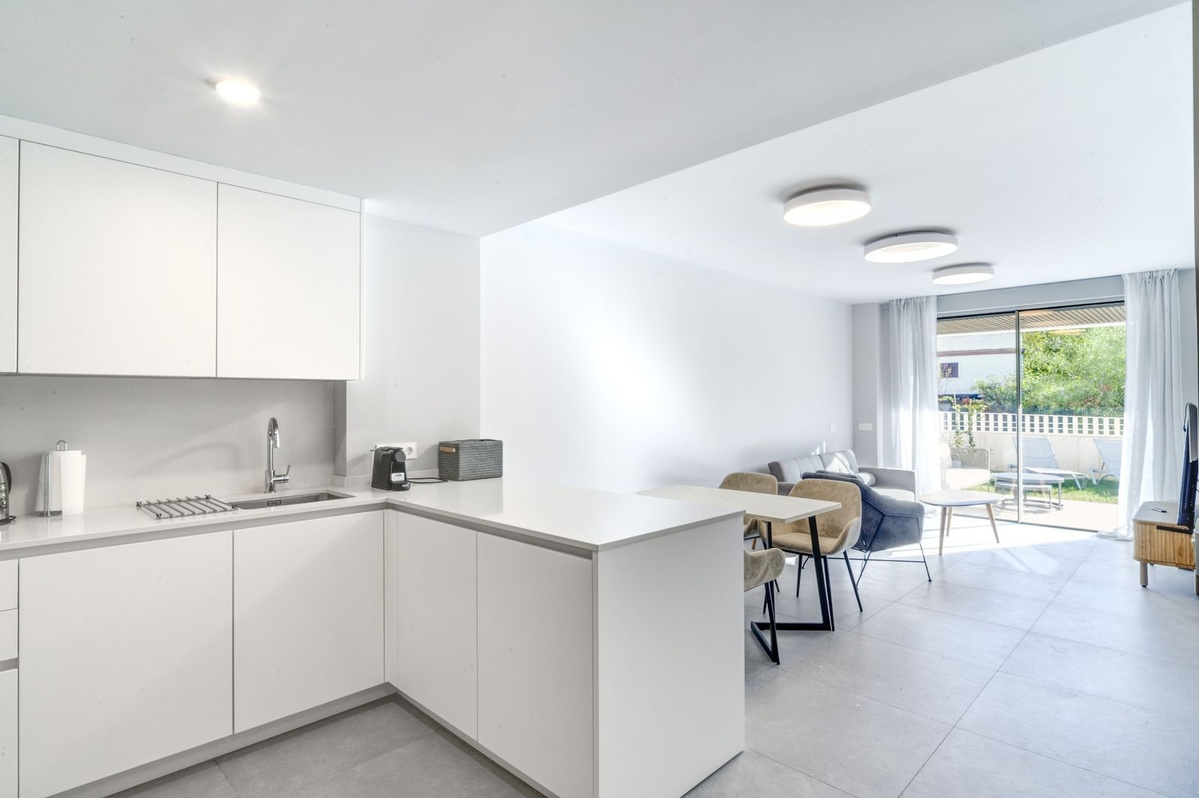 The apartment features a spacious open-plan living and dining area that flows seamlessly onto a private terrace and landscaped garden, ideal for relaxing or entertaining. The fully fitted kitchen comes complete with integrated appliances and a separate laundry area. The master bedroom includes an en-suite bathroom and direct access to the terrace, while a second bedroom and guest bathroom complete the interior layout.