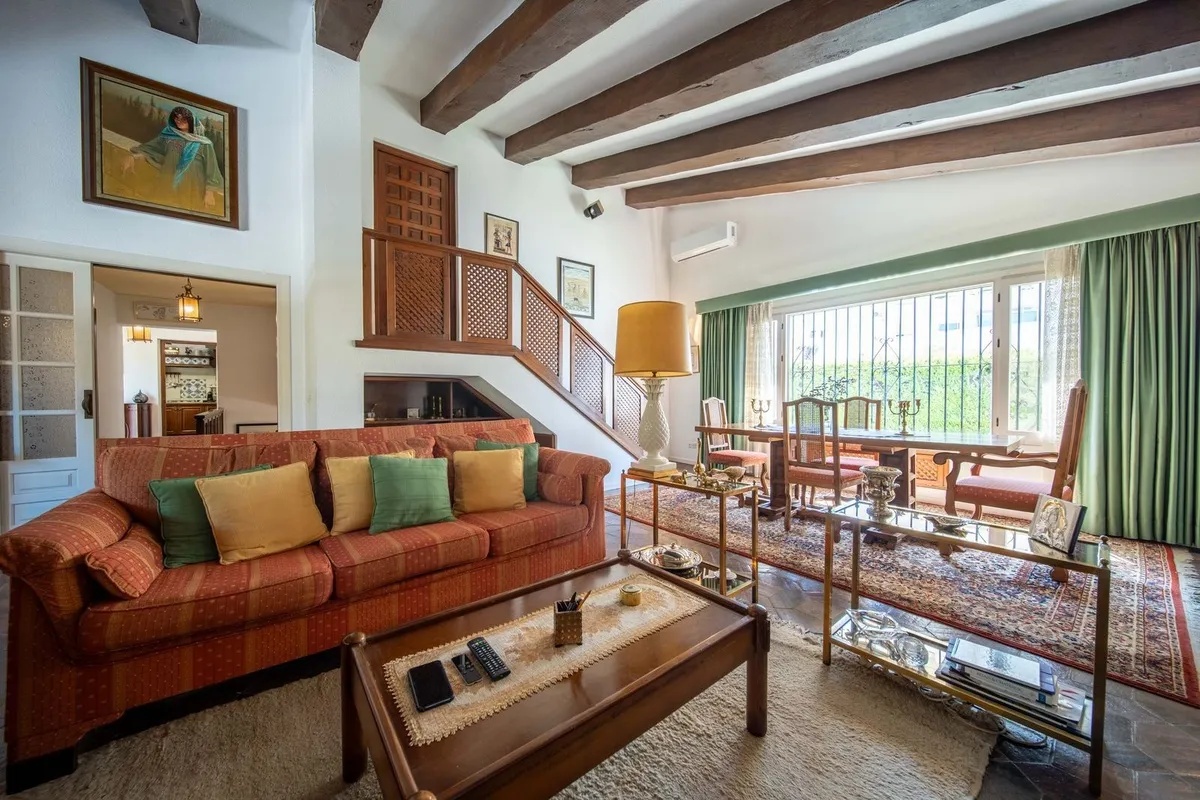 • A spacious living-dining room of over 60 m², featuring a high ceiling with decorative beams, a fireplace, and an elegant hardwood bookcase.