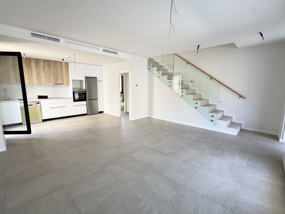 The open-plan living space connects seamlessly to the fully fitted kitchen, which comes complete with modern appliances and high-quality cabinetry. A striking staircase with glass balustrade enhances the modern design and creates a bright, airy atmosphere.