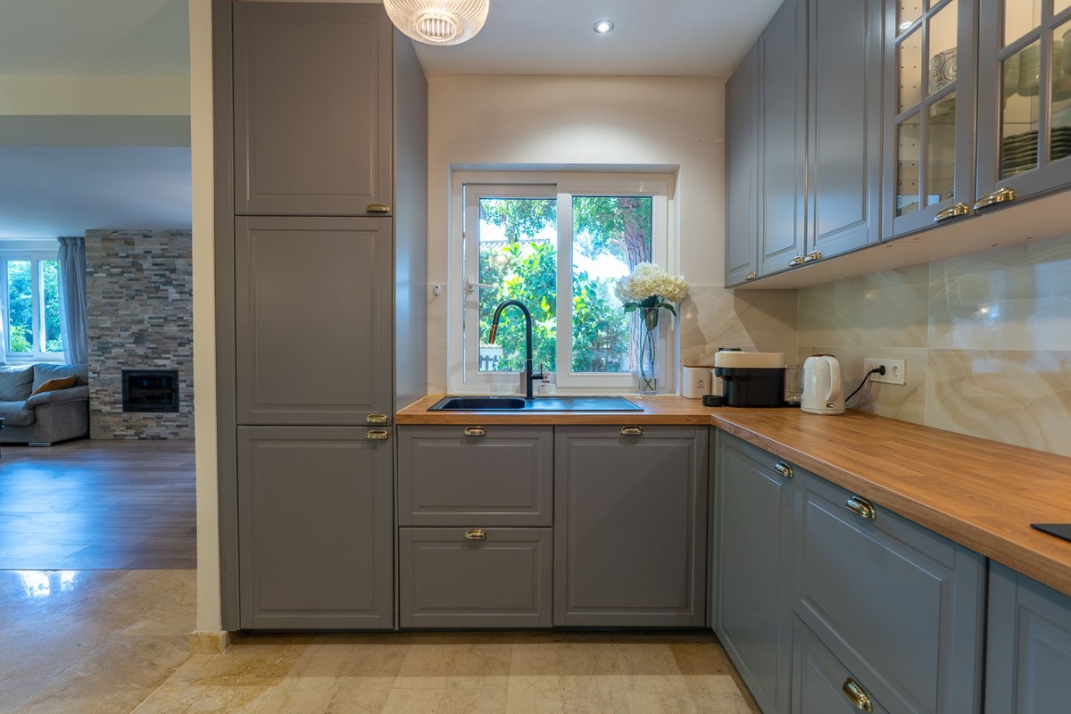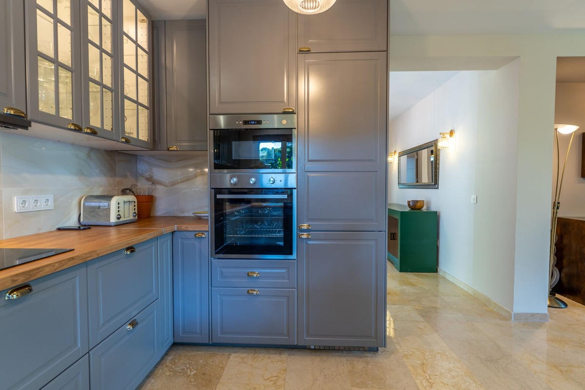 The outdoor spaces are designed for relaxation and entertaining. The villa includes a private swimming pool, landscaped garden, rooftop solarium, several sun-drenched terraces, and a covered dining area with a built-in barbecue. The home also benefits from a private garage, gated access, and a modern security system.