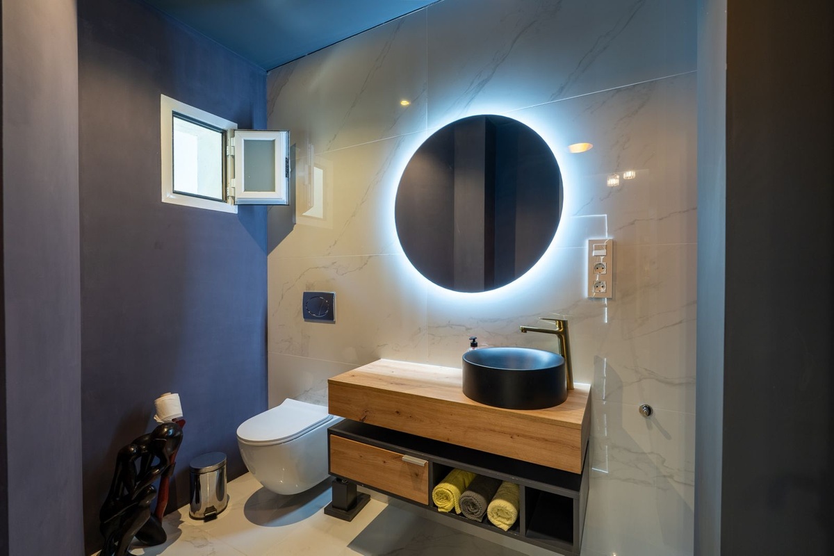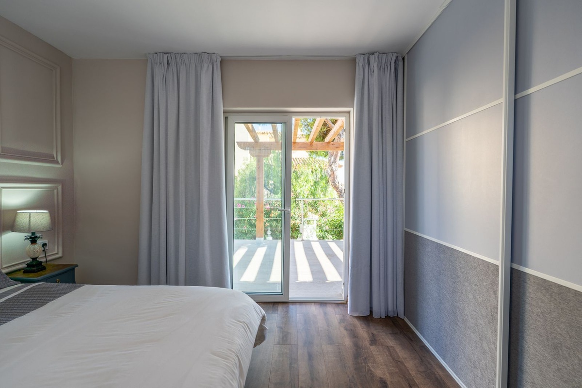 The villa is set on a private plot of approximately 637 square meters, with a total built area of 295 square meters distributed over two levels. With a south-facing orientation, the home enjoys abundant natural light throughout the day and offers open views to the sea, mountains, garden, and pool.